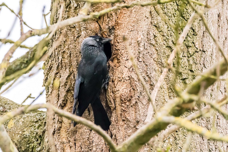 [1] Baby magpie [2] baby robins [3] a jackdaw trying to get into a woodpecker nest & [4] rooks: arch nest robbers on lookout in a dead tree.