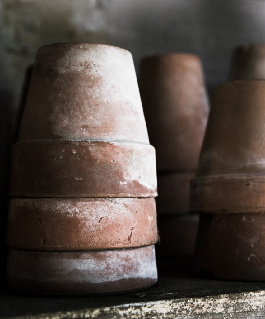 Untidy bug hotel and upturned flower pots