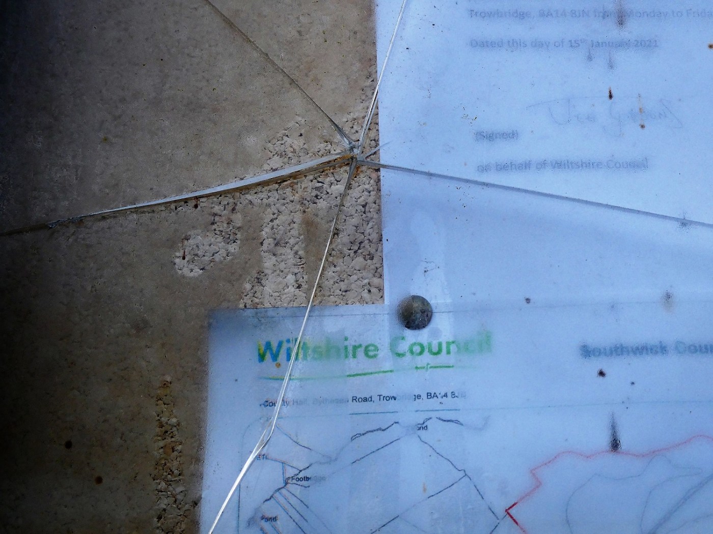 The perspex on the front of the notice board has been broken. We aren’t sure how, but it must have taken considerable force to achieve. The damage seems to be the outcome of a single blow: a stray firework perhaps?