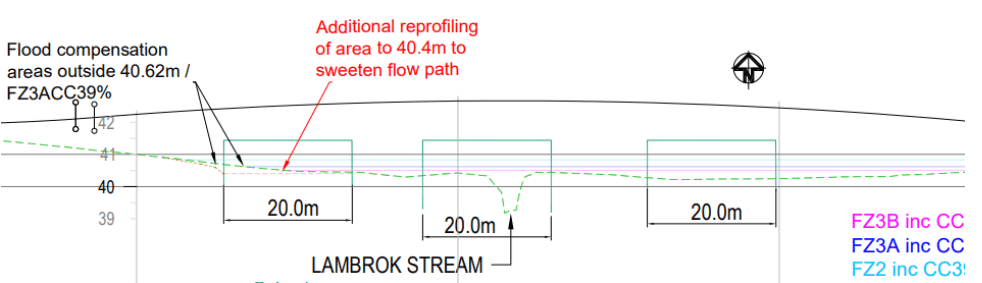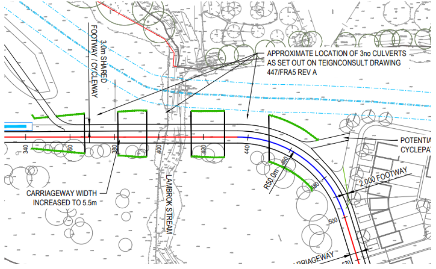 What you see above is an extract from one of the new documents that have now been submitted by developers Waddeton Park Ltd for their proposed housing site next to Southwick Court and across the road from Southwick CP Nature Reserve. The drawing shows that the bridge over the Lambrok, previously proposed for the access road from the A361, has been changed to a series of three culverts. They call them culverts but all three are twenty metres wide and really are three bridges separated by about 20m of embankment.