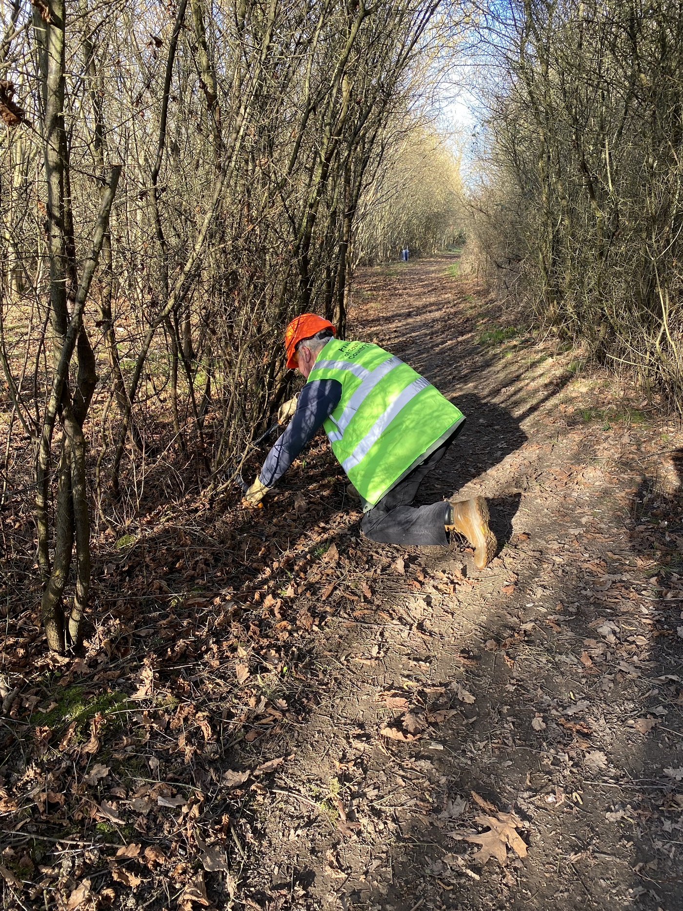 It was good to have Countryside Officers Ali Rasey and Gemma Thorp working with the Friends today. We were all somewhat dispersed around the reserve, much dependent on clearing up after the storms last week. David continued with clearing and securing the apple trees in the heritage orchard. Patrick, Joan and Gemma removed the door damaged by vandals from the Notice Board by the main entrance. Trish and Sarah returned to the copse to continue cutting back bramble and undergrowth prior to the removal of the diseased Ash. Clive and Phil tidied up storm damaged trees around Fiveways and also the Blackthorn Tunnel, Frank cleared drainage channels along the hard path between the pond and the footbridge into Village Green while Ali and I cleared the cut through by the Ancient Oak and helped Frank.