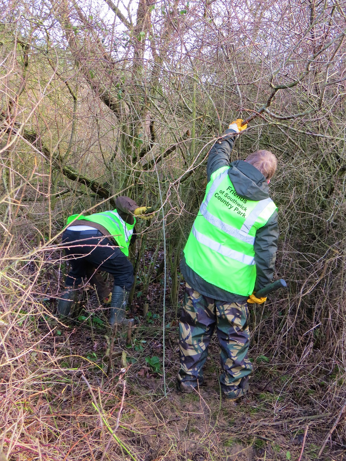 Having got thoroughly wet while we completed the tasks, we squelched to the picnic area for coffee and soggy biscuits and there were entertained by a Jay.ย ย The daffodils are just beginning to show where we have planted them in Village Green, and Snowdrops are making lovely displays all over the reserve.