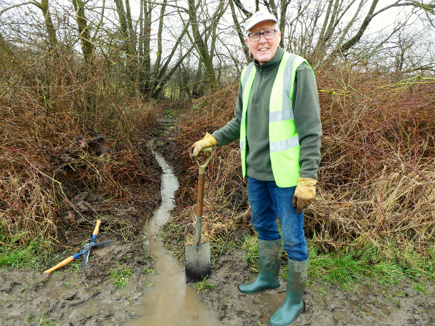 Frank wanted to continue draining the hard path in the area of the decorated bridge, having sorted out the drainage issues from the hard path between the footbridge into Village Green and the pond last week, so we all worked in that area. Frank, see photo, completed his task and has been awarded a Ditching Certificate of Incompetence 1st Class.