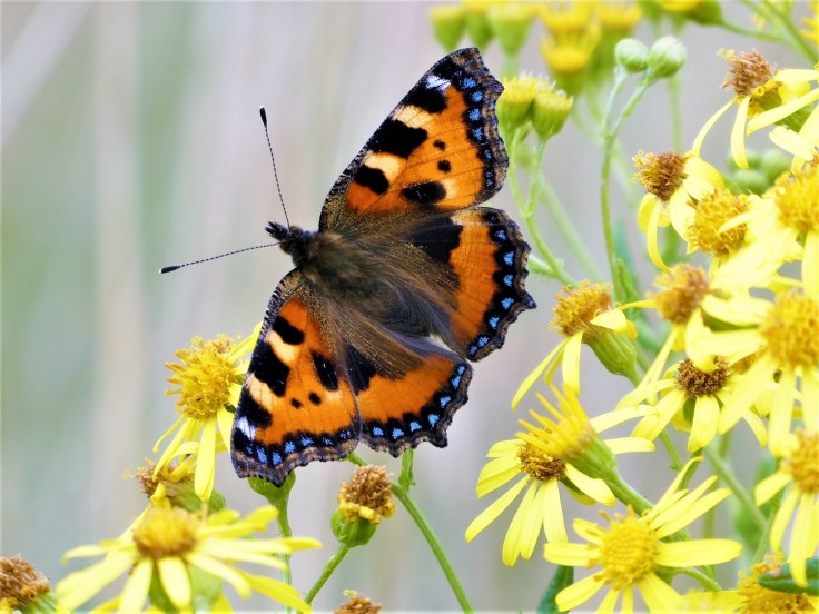 Research has shown that damage to the leading edge of a butterfly’s forewing can seriously affect its ability to fly but that damage to the wing’s margin has no detectable effect on its flight. So it is possible that despite its worn and torn wings this small tortoiseshell will be able to feed, find a mate and contribute to the next generation of caterpillars among the stinging nettles.