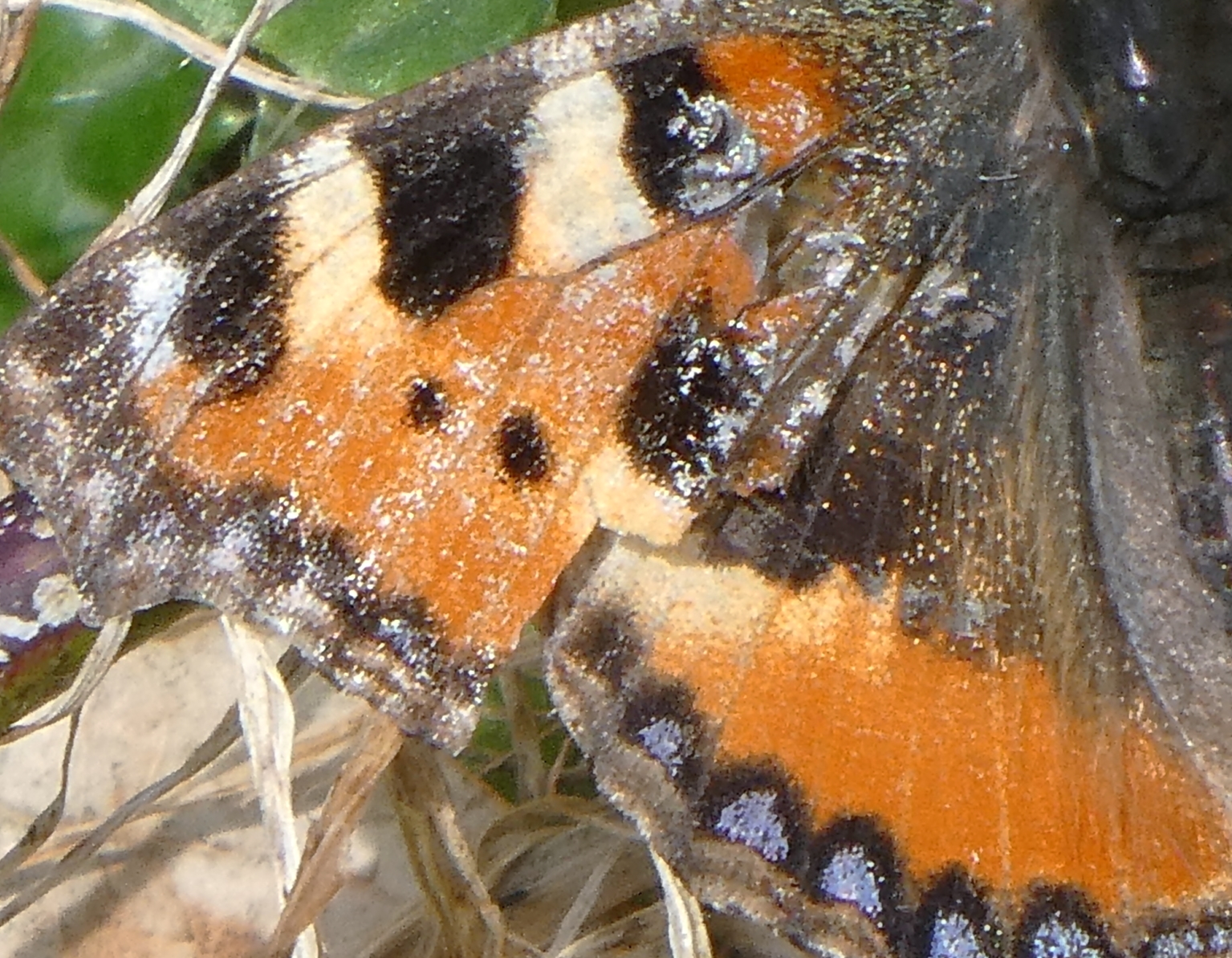 Butterflies enter a torpid state in hibernation, in which they can be attacked by spiders, mice or birds. If you look carefully, you can see that the forewing of this small tortoiseshell has been badly torn [2] by either a predator or a collision with something sharp such as a thorn.