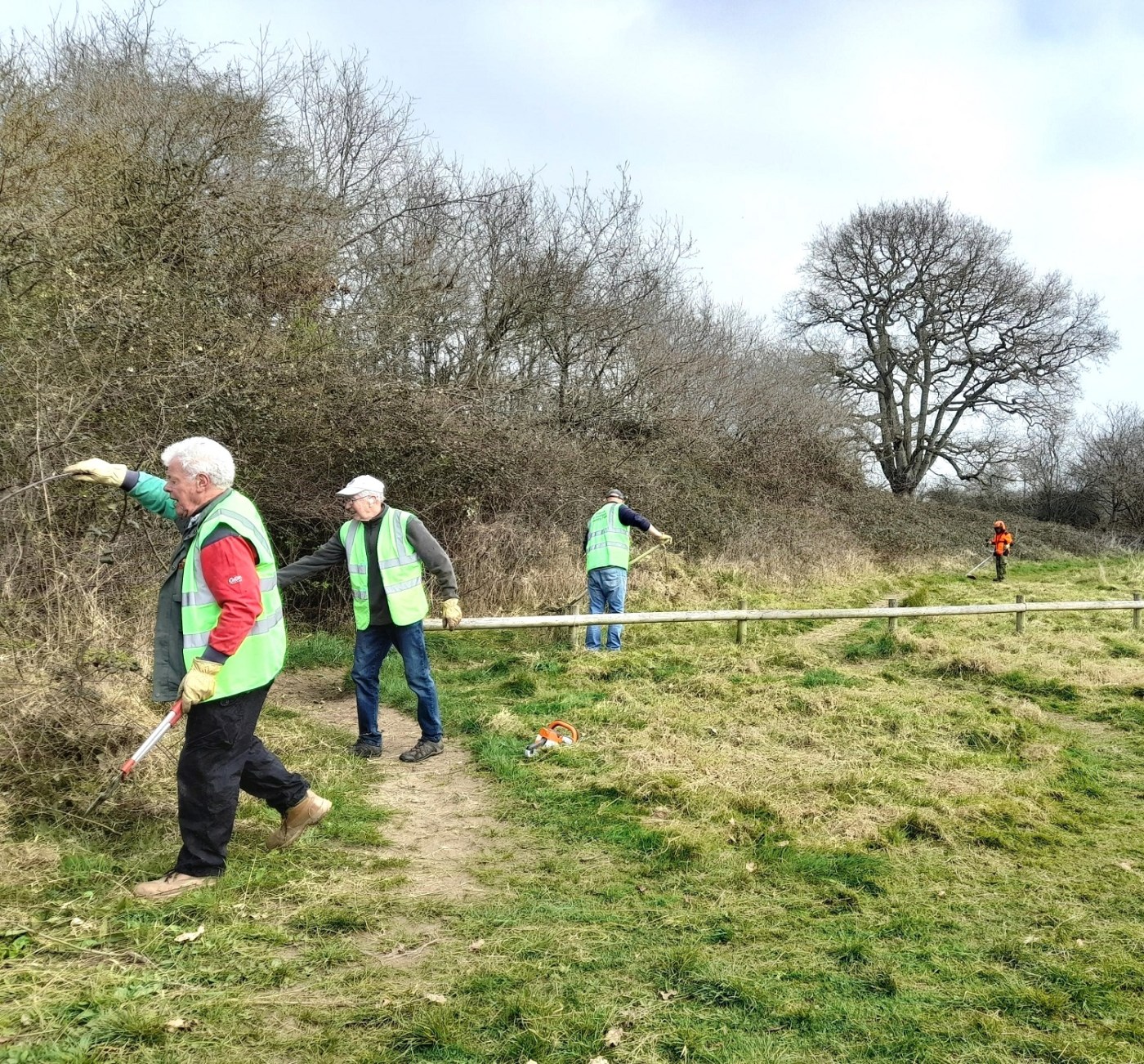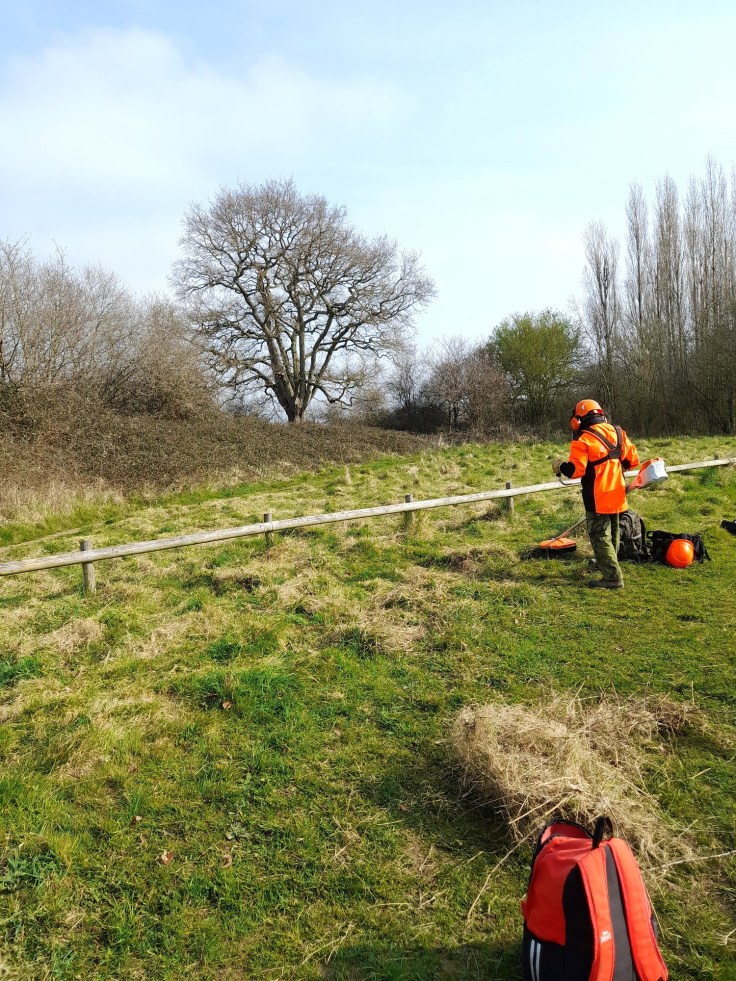 All this kit, particularly the batteries for the machines, together with rakes, pitchforks and helmets is quite heavy, so it is very useful to be able to load it all into Gemma’s Land Rover which took it down to the footbridge leading to Village Green. Clive, Phil, Frank and I met Gemma, offloaded the kit and began working the set-aside. What a difference power tools, as opposed to hand shears etc., make. Rotating use of the tools, we had soon cut down the Blackthorn arisings and cleared and broadened the path access to the area.