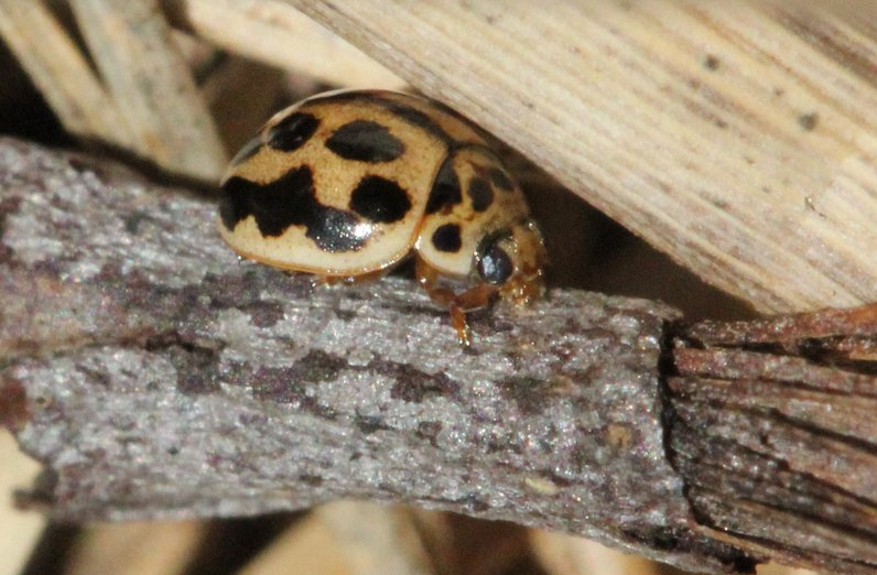 Sixteen spot ladybirds are beige, not red or yellow, with anywhere between 13 and 17 black spots that are sometimes joined together into splodges on the lower part of the wing cases. The diagnostic feature is the central black line where the wing covers meet. Only two species of ladybird have this central line: the 16 spot ladybird and the 14 spot, which is noticeably larger and brighter.