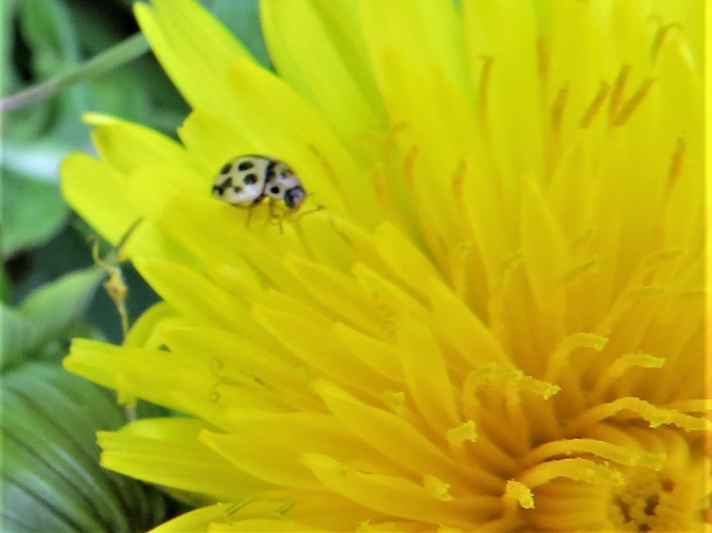 The 16 spot ladybird prefers to live in dry grassland. Unlike other ladybirds, it is not believed to be predatory; it eats mildews and other fungi, grass pollen, and the pollen and nectar of certain composite flowers. Dandelions are a favourite, even dandelions in the process of being photographed by a member of FoSCP more interested in botany than entomology.