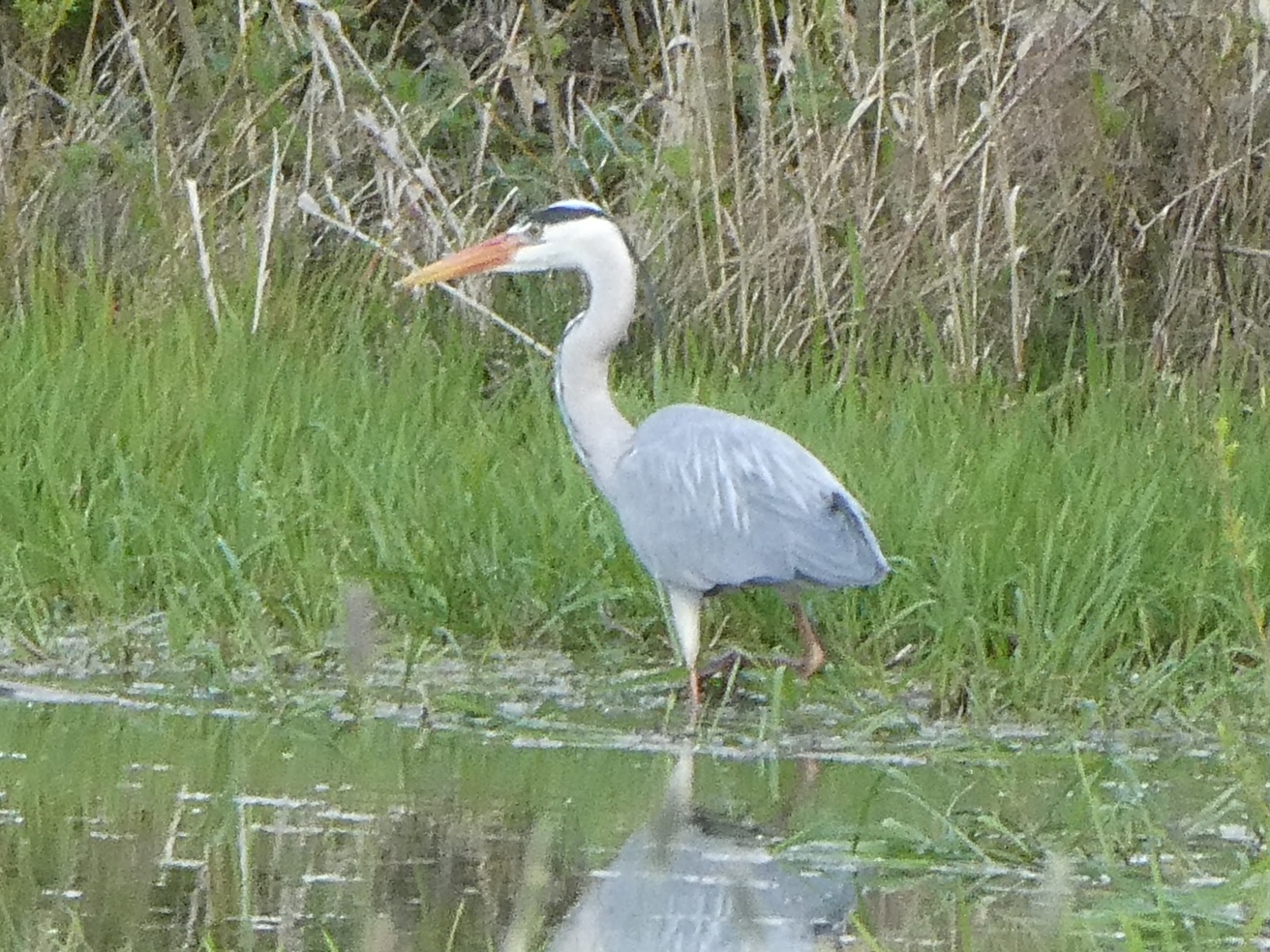 Walking around the reserve this afternoon, as I came round the top of Village Green, I saw this Grey Heron skim over the trees and land in the field near the big pond. It walked into the pond looking for food; it did catch several fish and because there were no people or dogs about it stayed on the pond for some time.