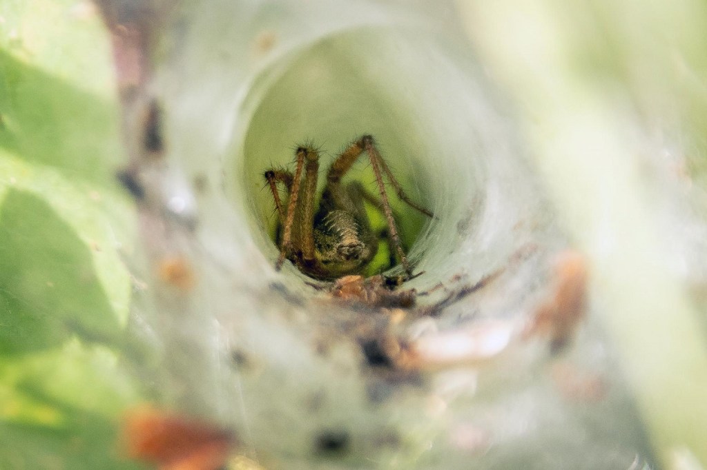 There are funnel shaped webs low down in the dense vegetation of the park’s hedges and edges; what lives in them?