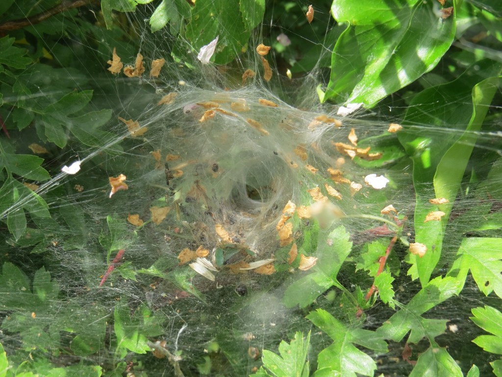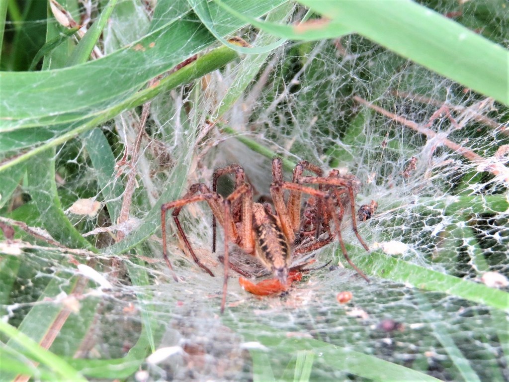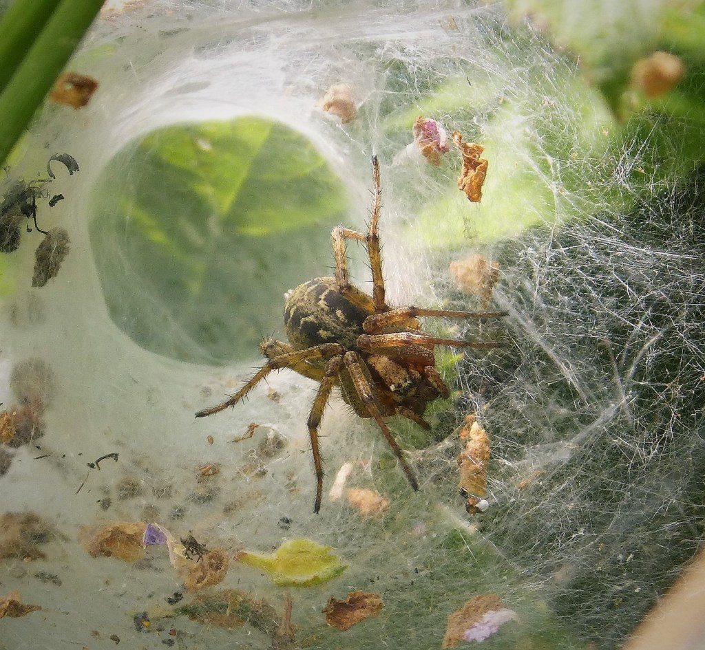 At this time of year the female may already have been mated and in the central chamber of her labyrinth could be busy constructing a large white egg sac that will eventually contain 50 – 130 eggs. She will suspend the sac in the chamber with many radiating threads of silk and begin to camouflage the outer part of her web with leaves and grass.