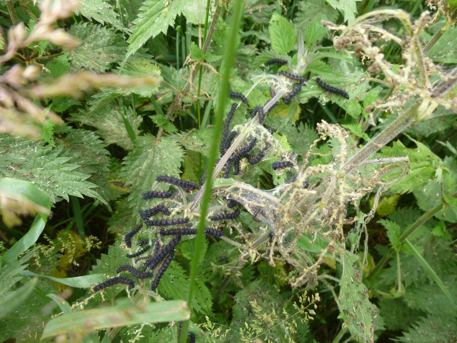 The female butterfly mates in the spring and lays her eggs, several hundred of them, under the topmost leaves of new nettles growing vigorously somewhere sunny. About two weeks later the eggs hatch into black spiky caterpillars with white spots. Like small tortoiseshell caterpillars, which they resemble at this stage, they stay together and spin a web around the top of the nettle to protect themselves from predators and adverse weather.