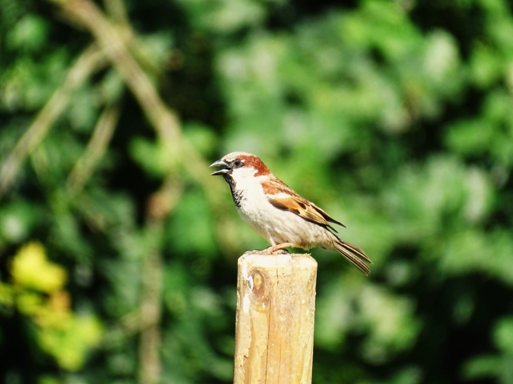 House sparrows are sexually dimorphic, which means that the males and females have different plumages. The male’s most distinctive feature is his bright chestnut coloured head, topped with a grey cap, whereas the female is camouflaged all over in grey and brown freckles. Tree sparrow males and females look exactly the same, very like a male house sparrow but without the grey cap.