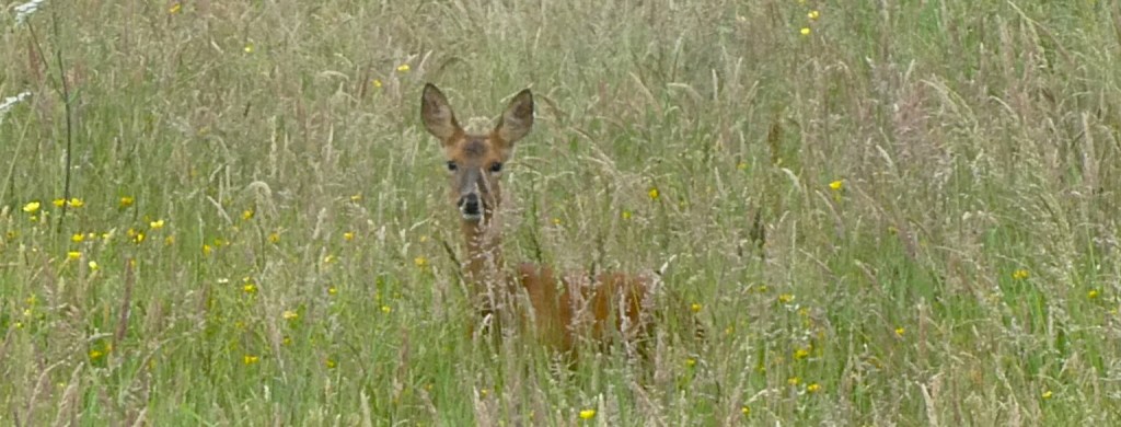 A real bonus! At the top of Village Green set-aside, near the seat, I suddenly realised this young Roe deer doe was nestled down in the long grass. I had intended continuing on the butterfly transect but I did not want to disturb her so I just took these pics and retreated carefully away.
