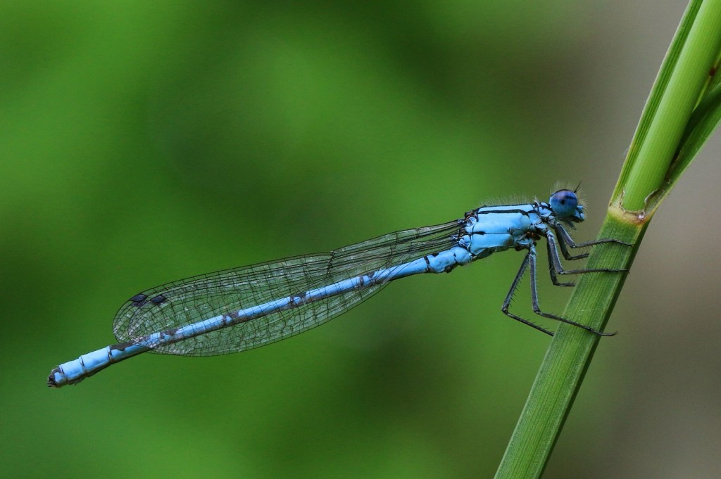 All Odonates have two pairs of wings but a damselfly’s wings are all the same size and shape whereas dragonflies have differently shaped fore and hind wings: their hind wings are much broader and taper towards the body.