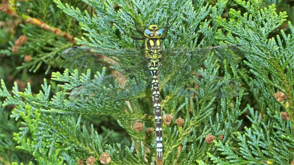 We walked round to Puddle Corner then all the way around Sleepers. On the encroaching brambles and nettles to the right going up lots of Gatekeepers, Meadow Browns, Ringlets, Large White and Marbled Whites and Skippers. Half way up the hedge a dragonfly buzzed us and then settled. I thought was a Brown Hawker, but I am not now so sure and I have sent the picture off to Rosie [County Recorder] to verify.