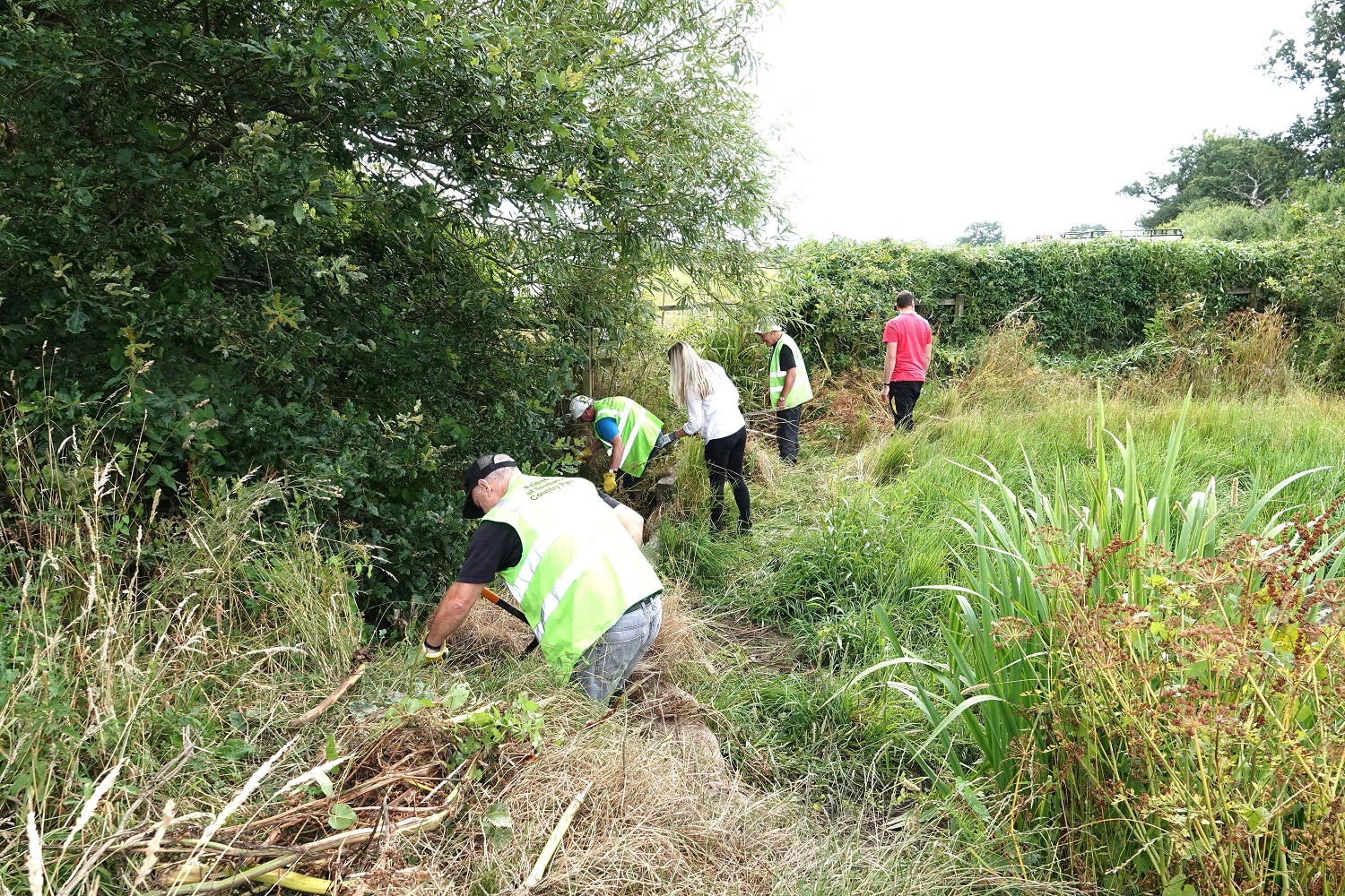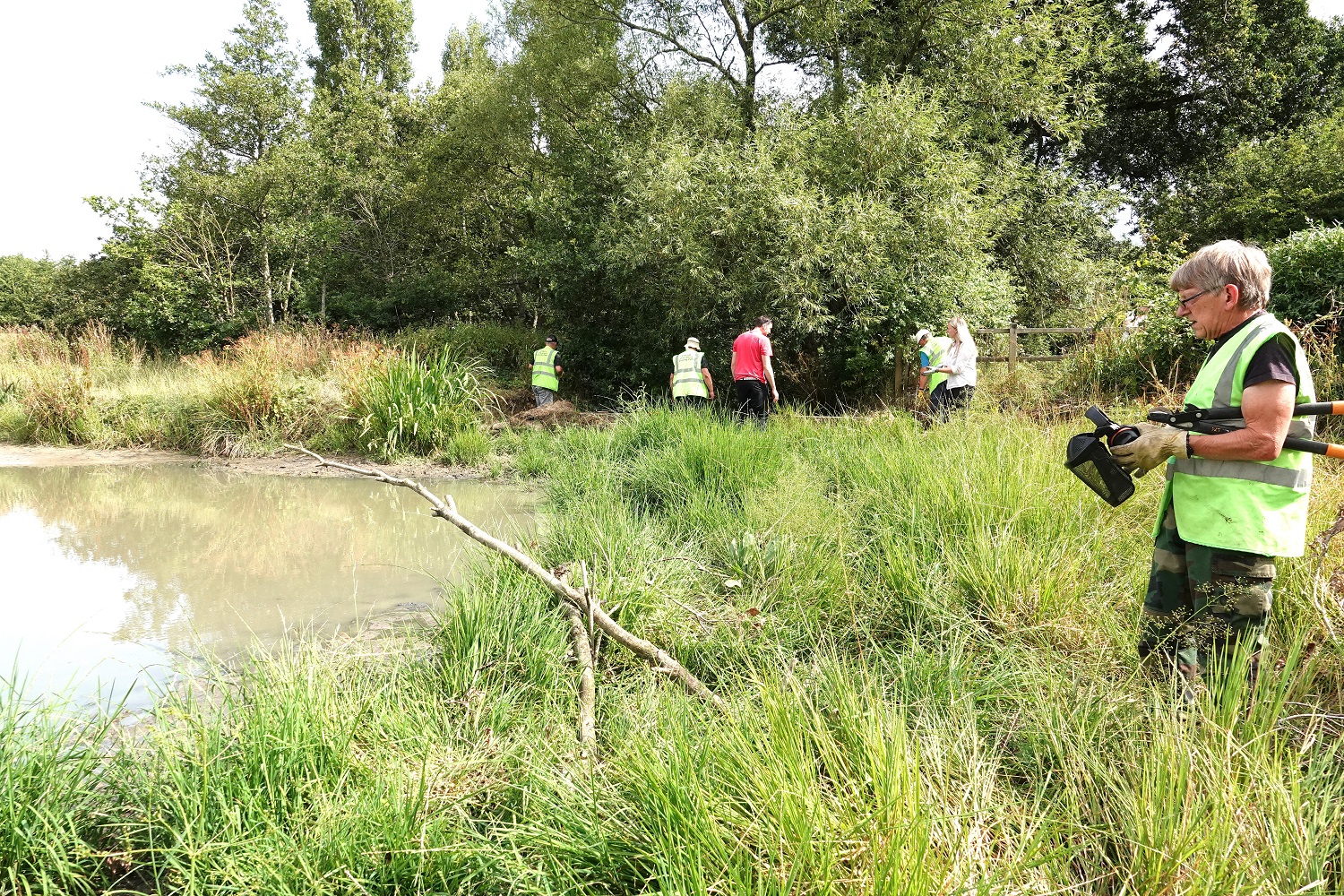 Because the exposed silt and mud around the edges of the pond were firm enough to stand on, Team A was able to clear the vegetation around the dam while Team B tackled the hedge by the hard path.