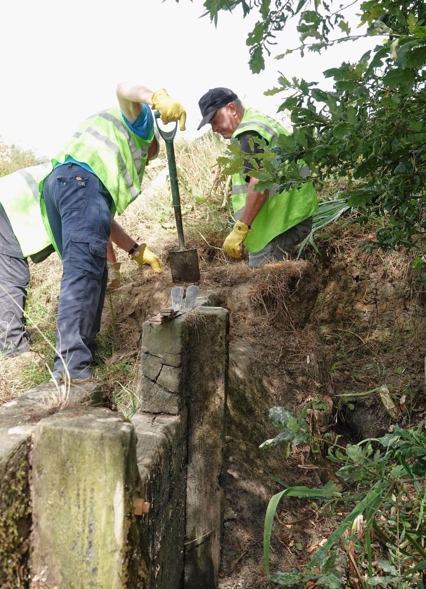 Because the exposed silt and mud around the edges of the pond were firm enough to stand on, Team A was able to clear the vegetation around the dam while Team B tackled the hedge by the hard path.
