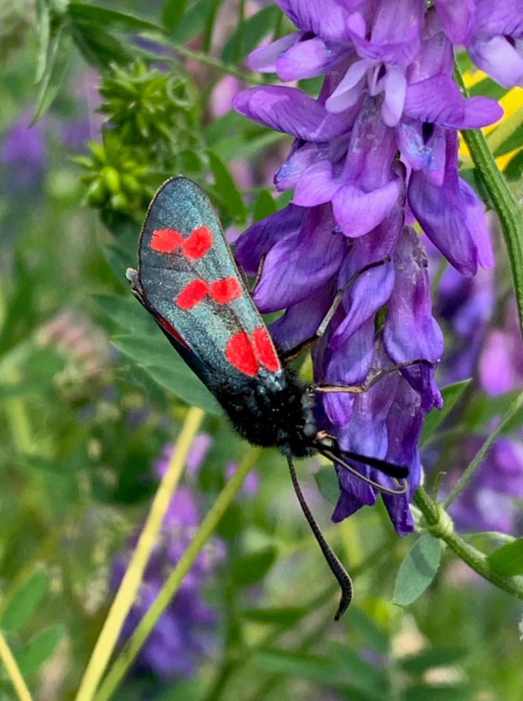 This is a six spot burnet moth (Zygaena filipendulae), a dayflying nectar feeder, photographed on the reserve’s plentiful, nectar-rich, tufted vetch.