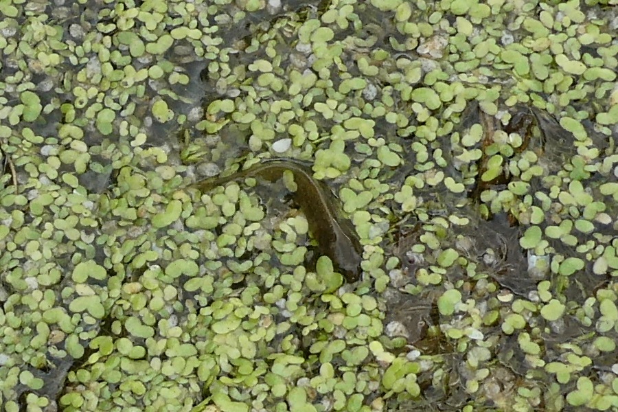 When I pushed the Duckweed away with a stick, a small newt eft, about an inch long, wiggled to the surface before diving down again. I couldn’t tell what type of newt it was, but there must be more of them there. Success!