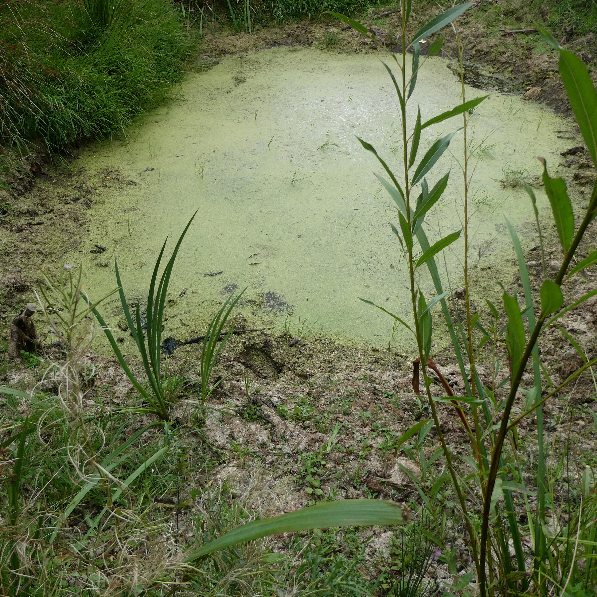 The Iris Pond retaining some water despite the drought and a tiny newt eft among the duckweed.