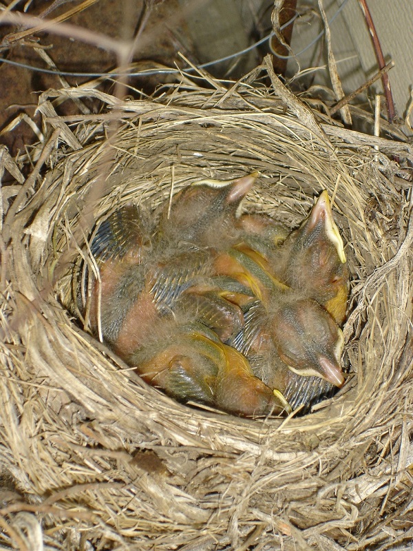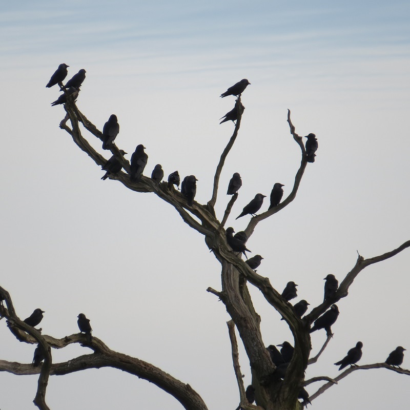 [1] Baby magpie [2] baby robins [3] a jackdaw trying to get into a woodpecker nest & [4] rooks, arch nest robbers on lookout in a dead tree.