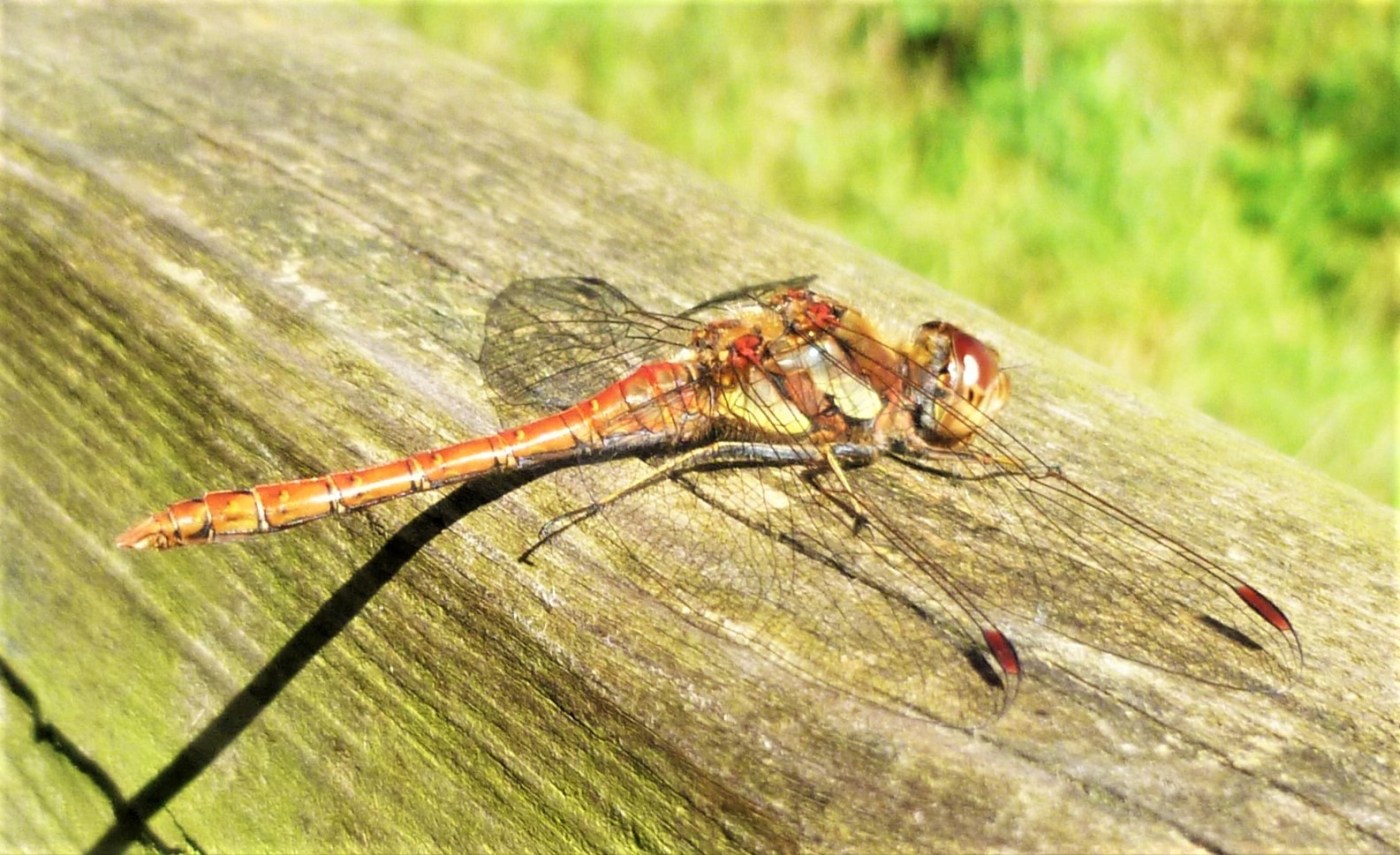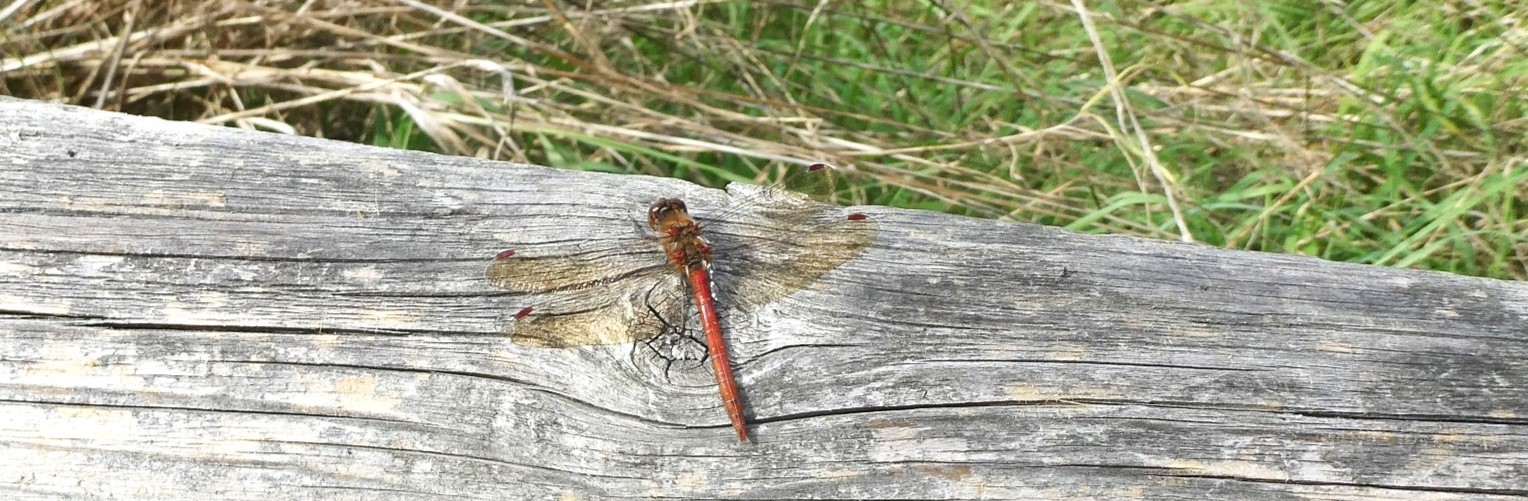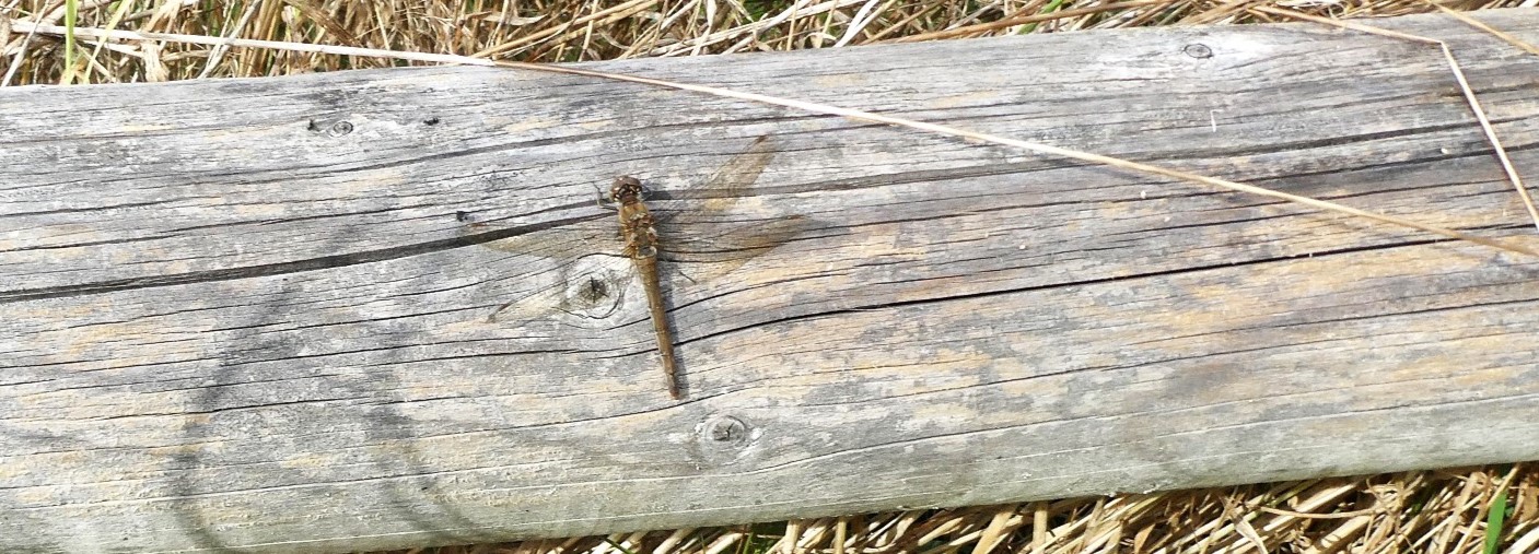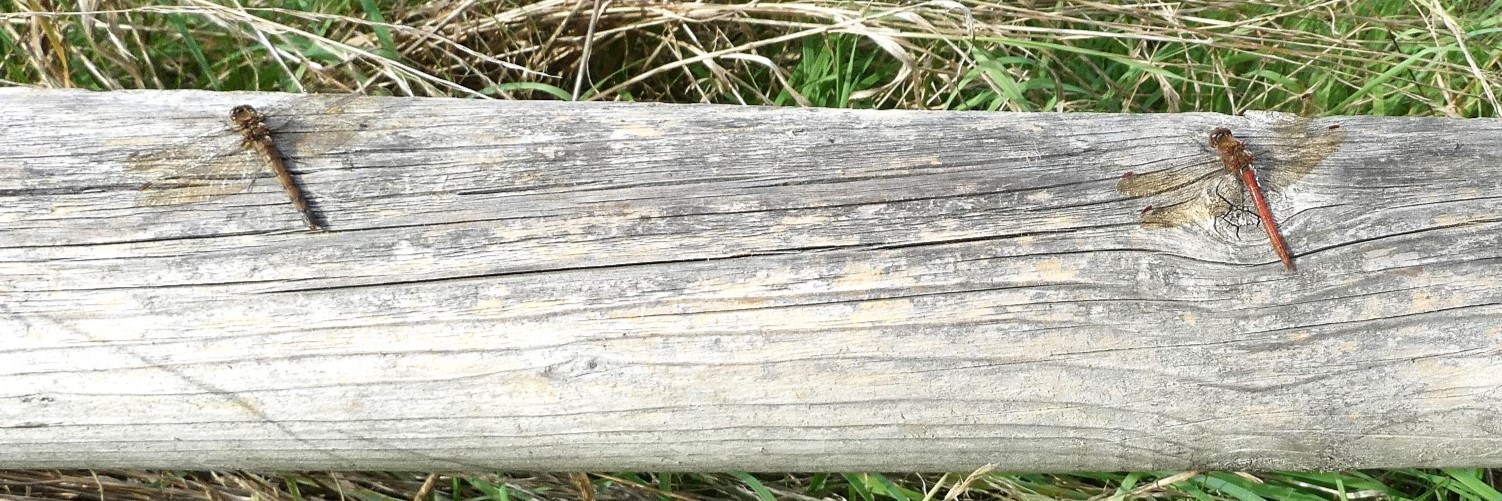 The pair both settled on the low wooden rail and I managed to get a quick shot of the male: a Common Darter. There was more movement over the tall grass and I realised there were more dragonflies. In the end, I had counted three pairs of Common Darters, all resting on the rail and sunning themselves.