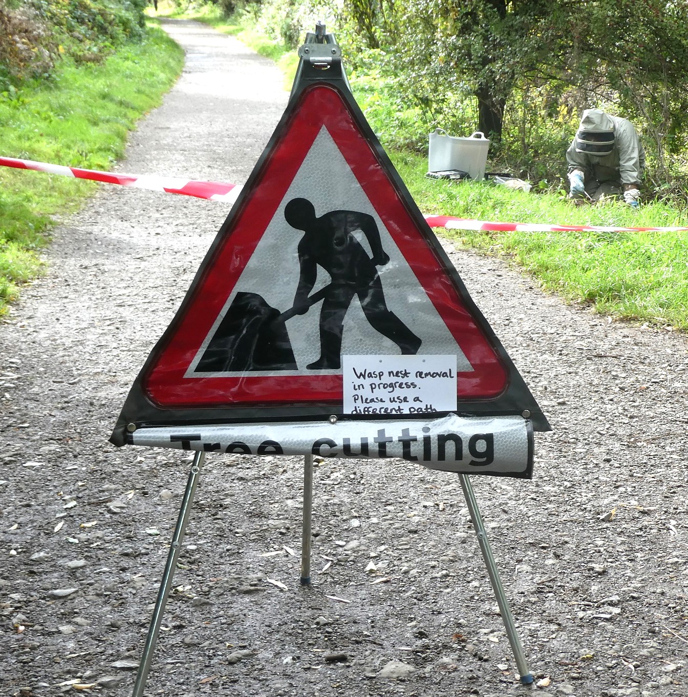 We closed the path by the footbridge into Village Green, with walkers diverted over the bridge or up the Blackthorn tunnel, and, at the other end of the danger zone, we closed the path near the pond, with walkers diverted into Kestrel Field. Ali and I stood guard at either end of the closed section of path just to be sure, while Dr Brown kitted up and set to work.