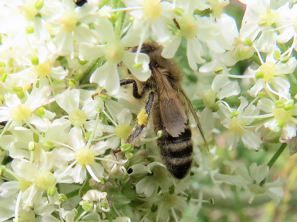 Like all winged Hymenoptera, honey bees have two sets of wings: a larger outer pair and a smaller inner pair. When the bee is flying, the large wing and the small one are hooked together with Velcro-like teeth called hamuli. At rest, the wings are unhooked for easy storage, the outer wing folding over the inner one.