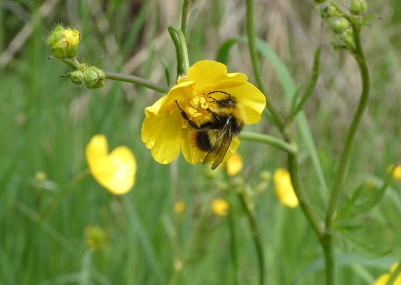 The buttercups will attract short-tongued native bees such as the large scissor bee (Chelostoma florisomne), and early bumble bee (Bombus pratorum), species which can’t reach the hidden nectaries of bell shaped flowers. The large scissor bee is also called the sleepy carpenter bee. Its specific name, florisomne, means flower sleeper and in bad weather this bee can be found curled up, apparently asleep, inside buttercup flowers.