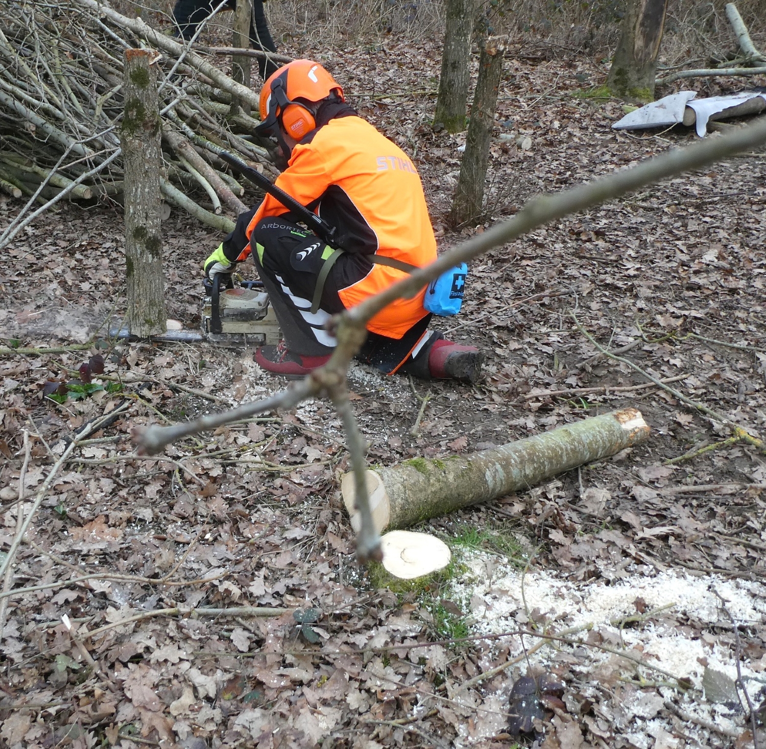 A good morning’s work clearing and tidying up in the copse at the top of Village Green where we had the camper at the end of the summer and more recently youths cutting down and burning some of the trees. Whereas the camper had only taken down dead Ash [with a blue spot] the teenagers had cut down potentially good Oak trees. The stumps have now been made safe by cutting them back to ground level. We have stacked the brash ready for future chipping, and identified stakes for helping to create robust dead hedging to protect veteran trees. Some lovely sunny glades should develop over the summer.