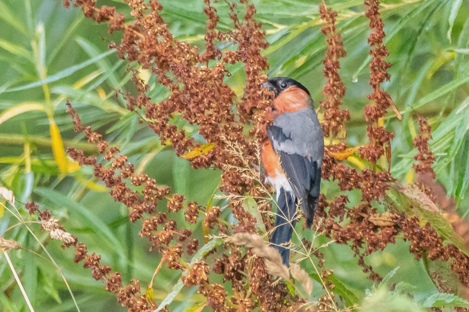 Below are pictures taken by DKG in the summer of 2018 of a bullfinch feeding in the park on dock seeds.