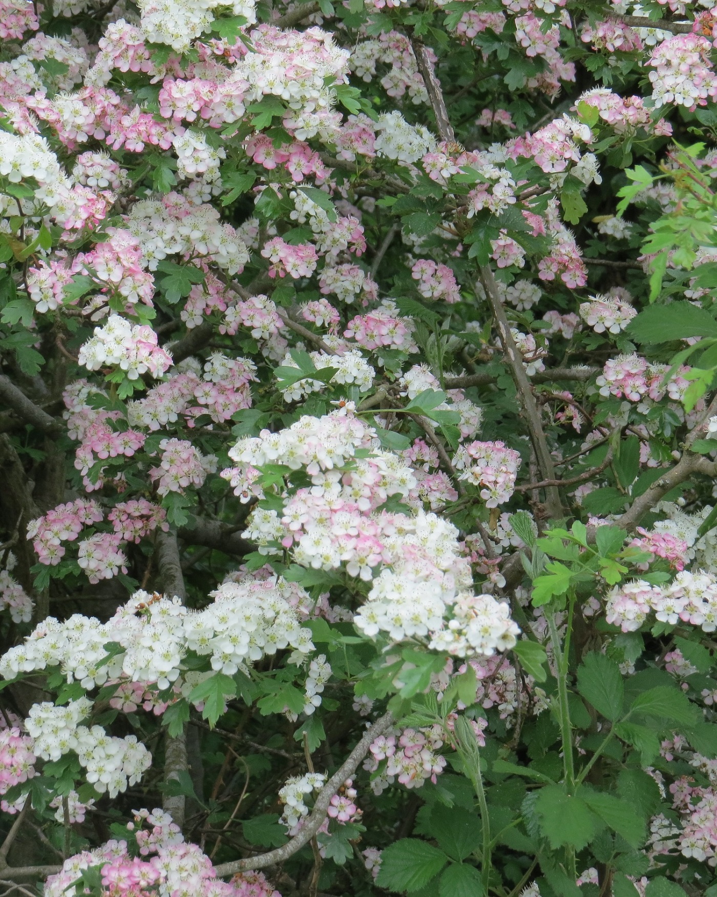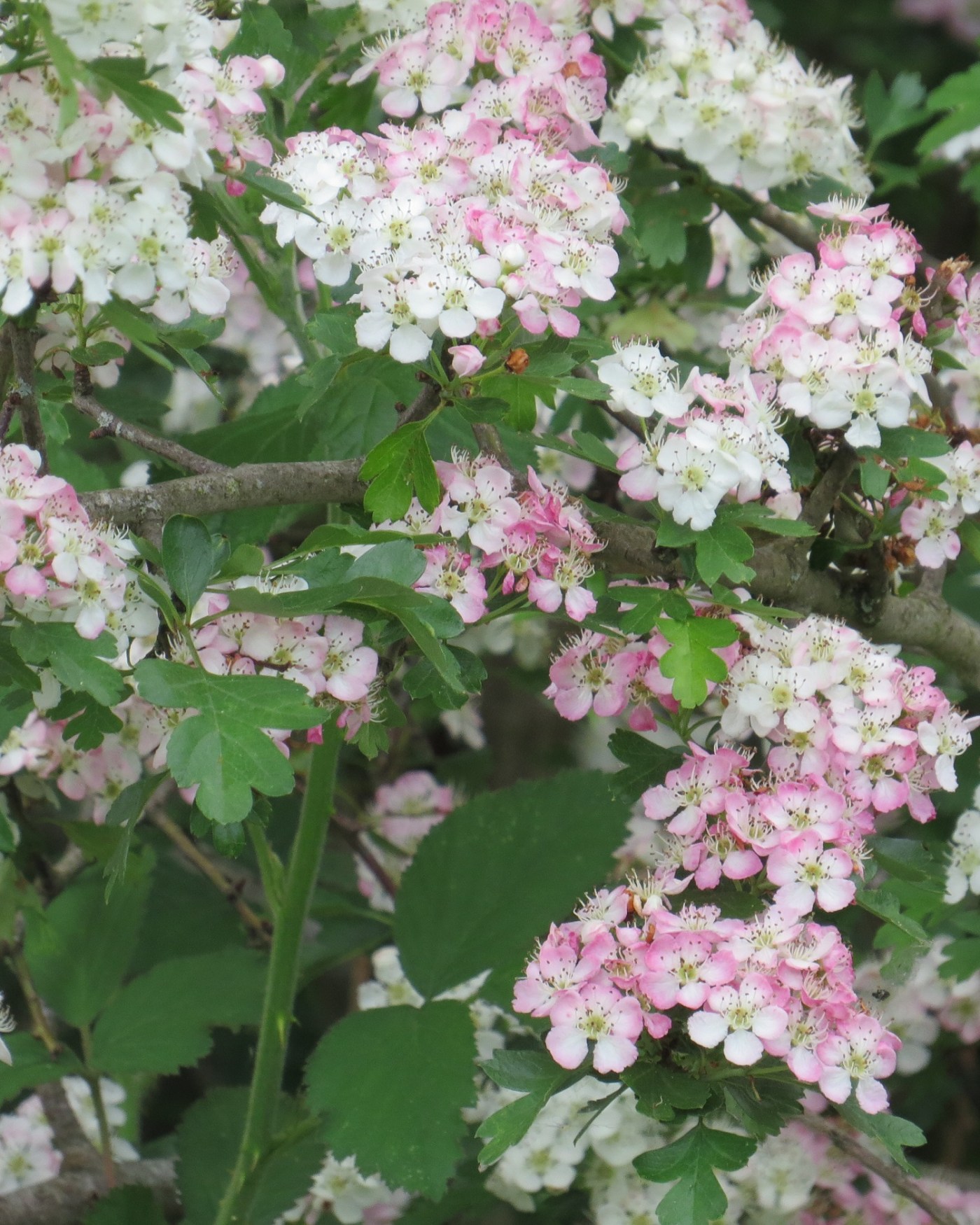 Many authoritative voices are ready to agree that hawthorn flowers are white and sometimes pink but if you enquire further, asking why it can be pink one year and white the next, you soon find yourself in the hands of people trying to sell you tincture of hawthorn for your congestive heart failure. Authorities also agree that the bright pink and red garden varieties of hawthorn (which are all cultivars of Crataegus laevigata) are sterile so it can’t be a cross-fertilisation thing like polyanthus turning your primroses red.