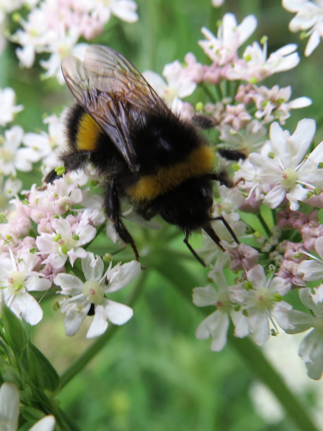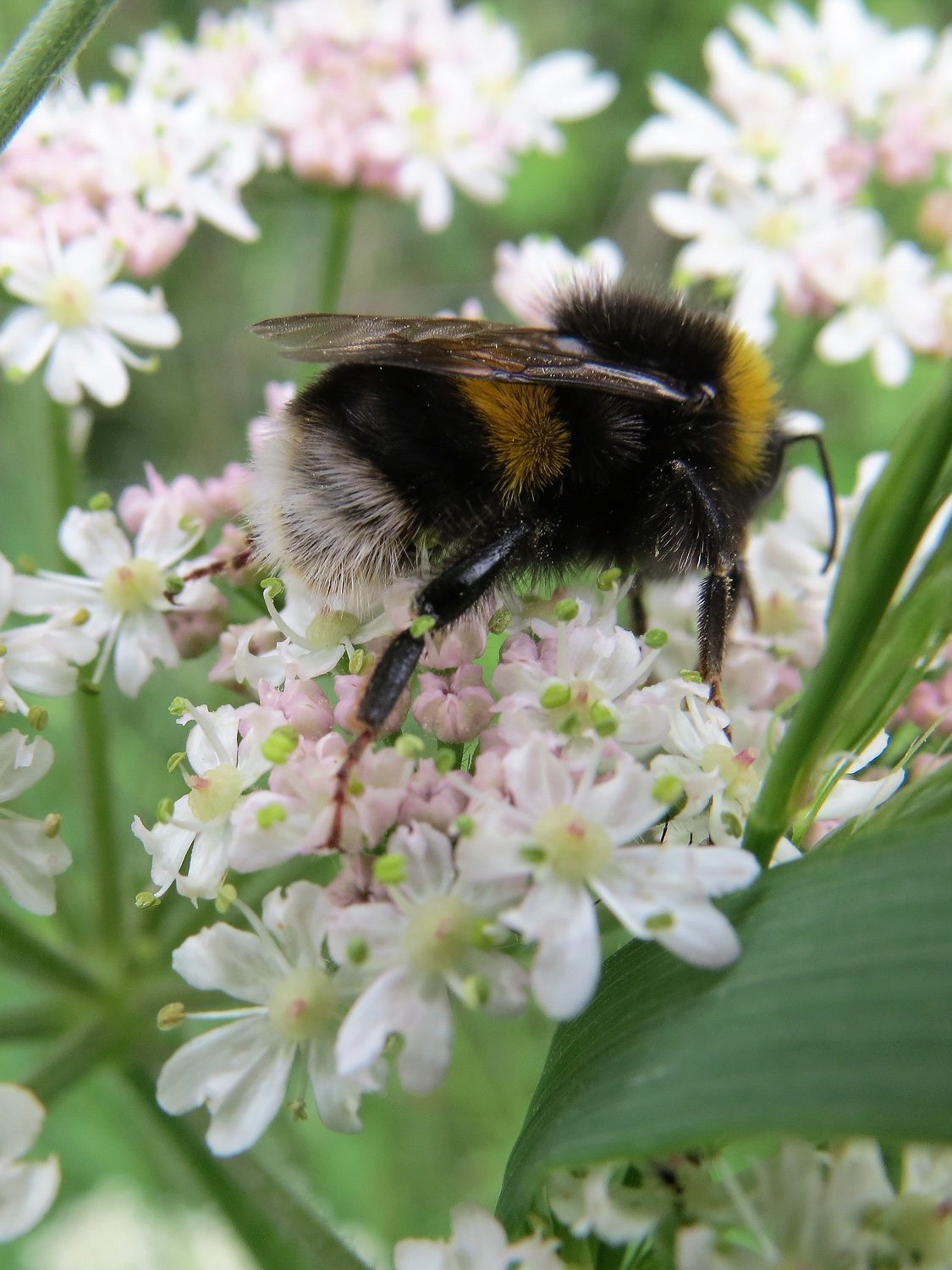 Buff-tailed bumblebees collecting nectar on hogweed.