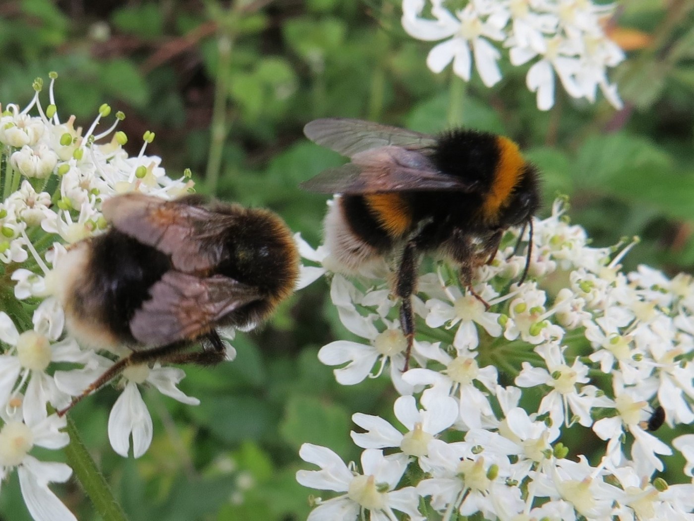 Buff-tailed bumblebees collecting nectar on hogweed.
