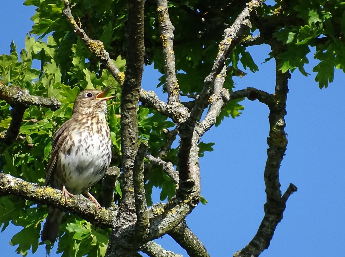 A song thrush singing his heart out from the top of one of our oak trees. Thanks for the picture Cheryl Cronnie. Song Thrush recorded by David Bisset (CC BY-SA 2.0) xeno-canto.com Share on your social media: Click to share on Facebook (Opens in new window) Facebook Click to share on X (Opens in new window) X Like Loading... 2 thoughts on “” Sadly I have not seen or heard a song thrush for a very long time There must be half a dozen song thrush breeding territories in the reserve. Back in April it sounded as if there was a song thrush at the top of every tree. Comments are closed.