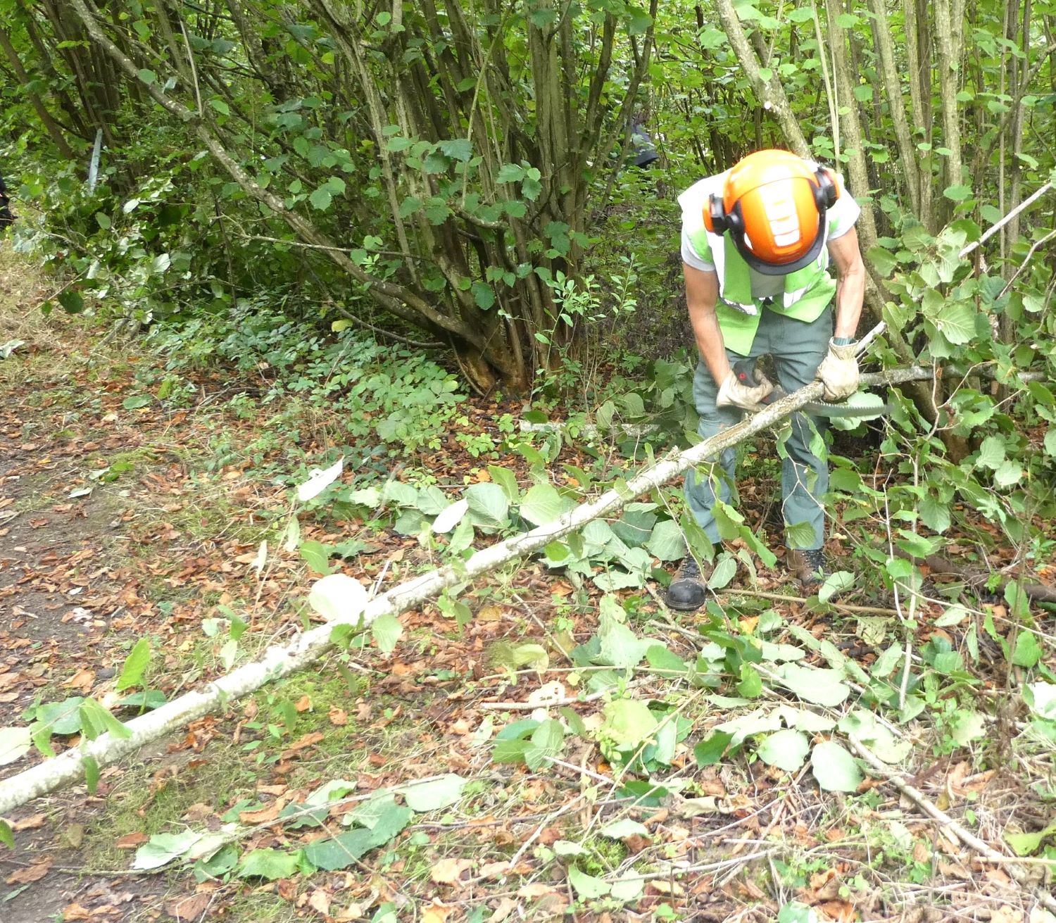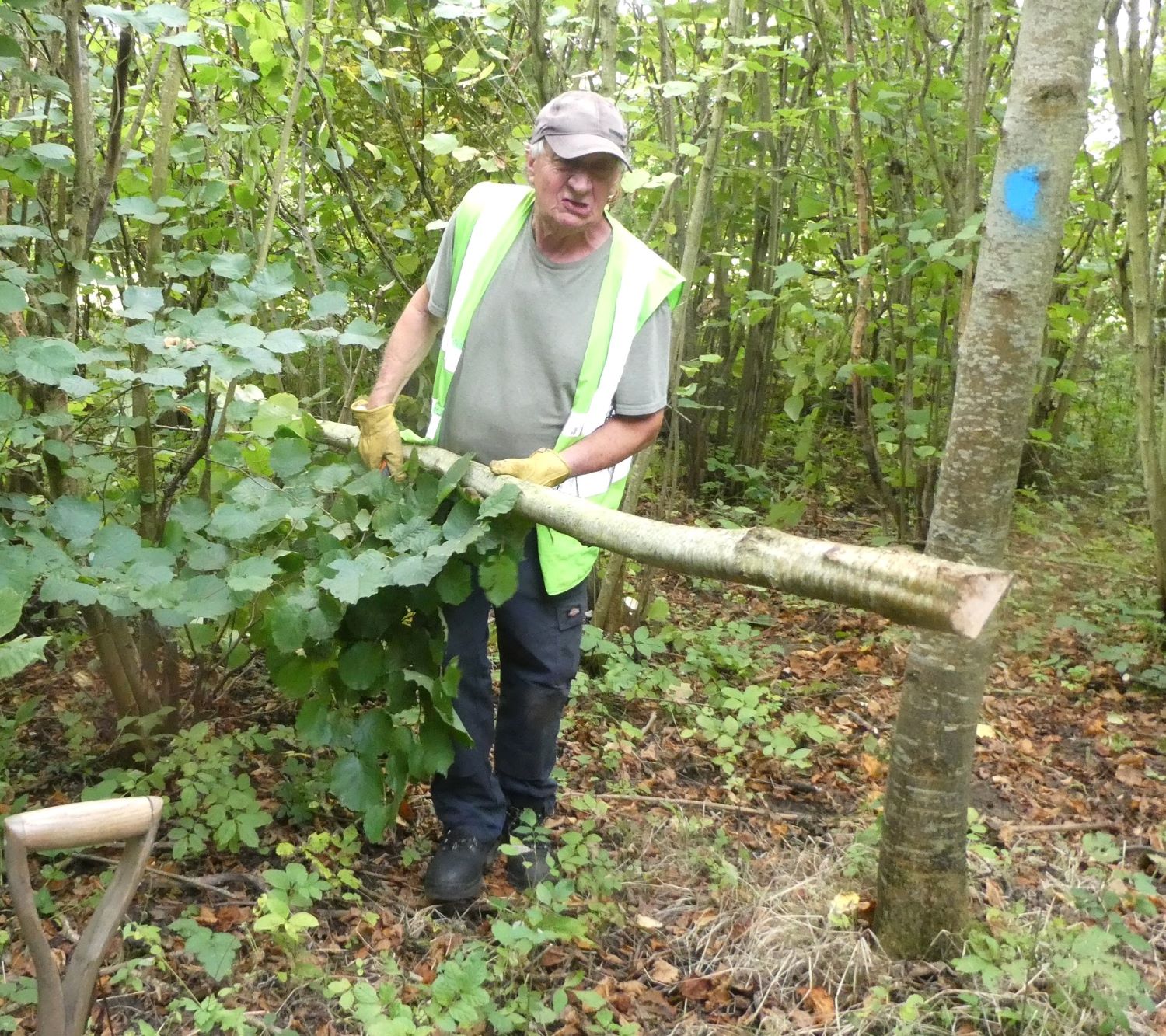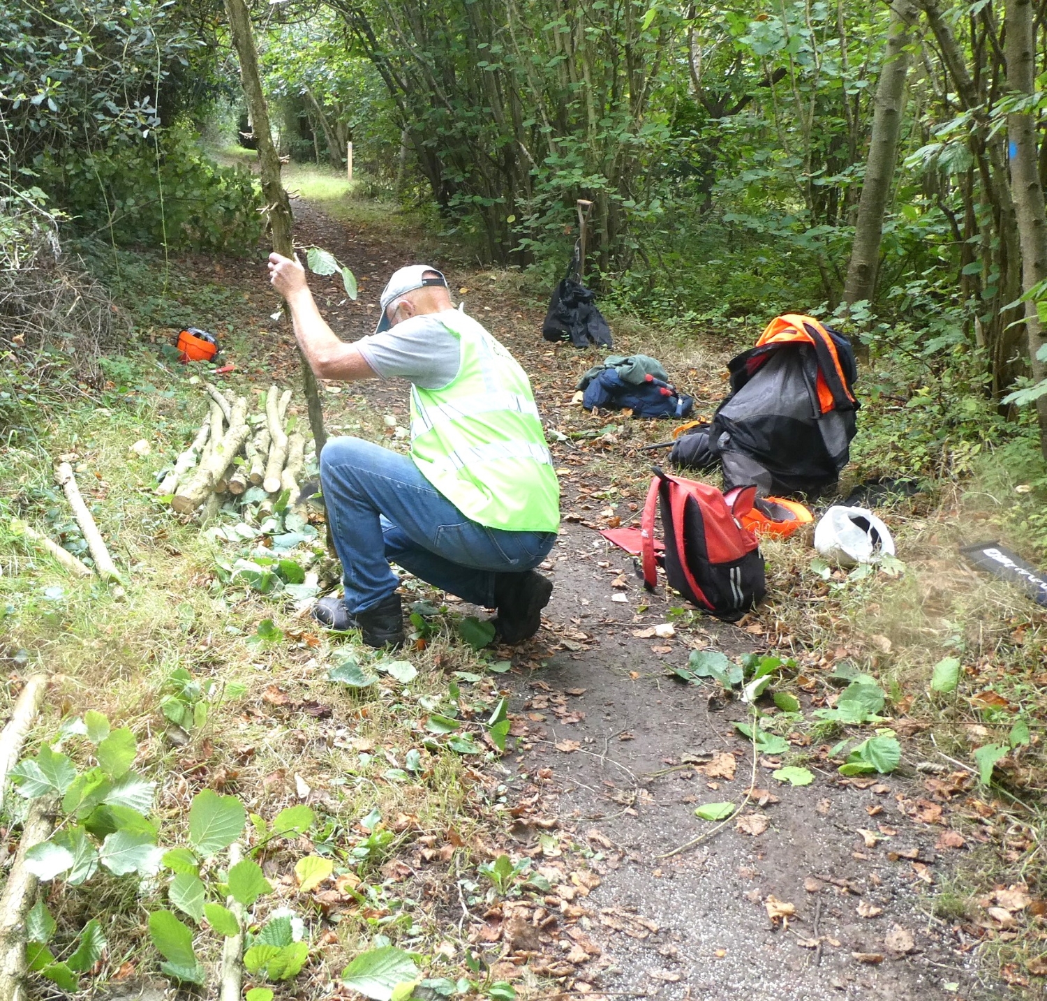 The morning’s task was to cut, prepare and store enough hazel stakes to provide the structure for dead hedges to protect the banks and streams on either side of the footbridges into Studley Close and Village Green.