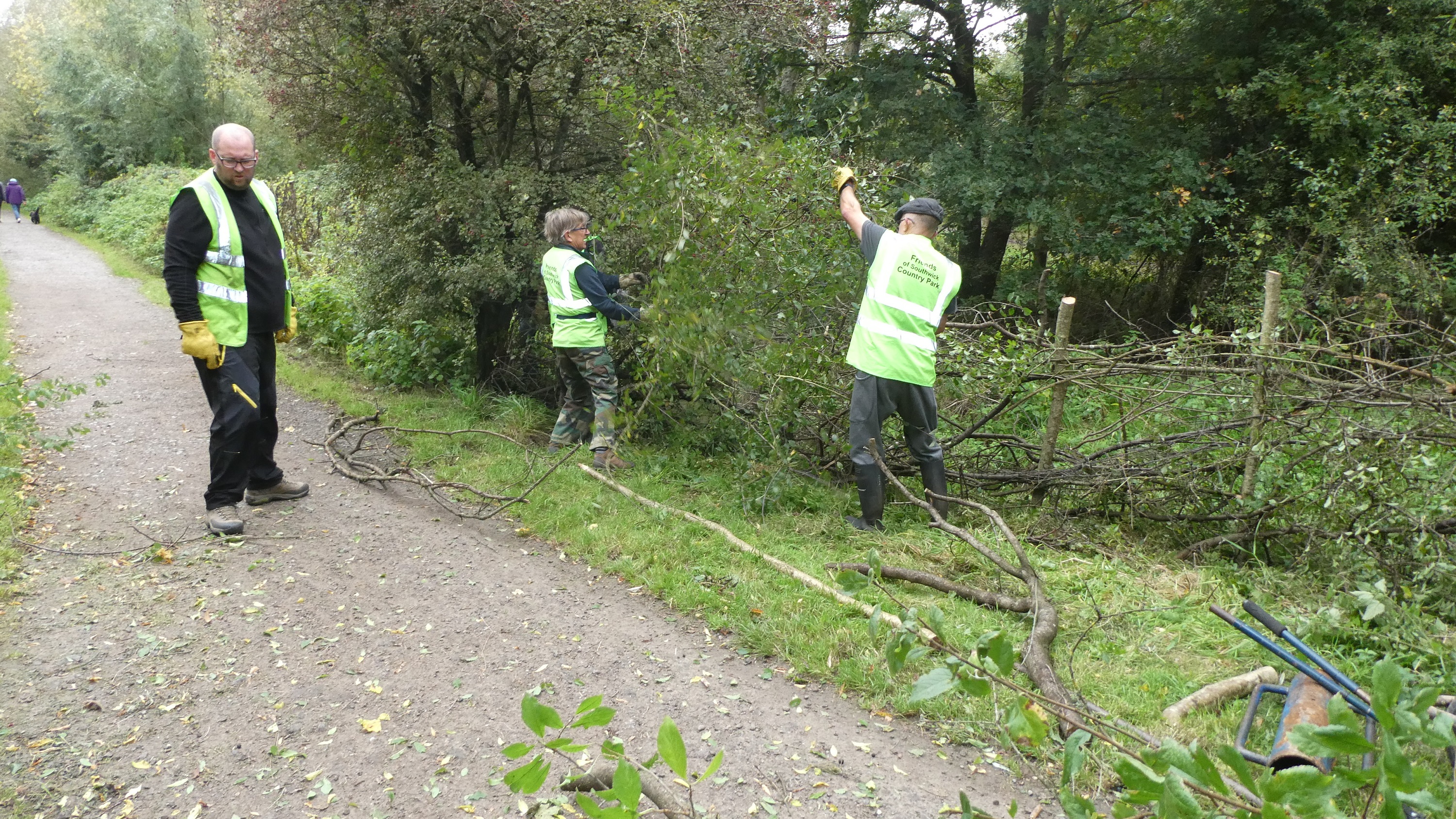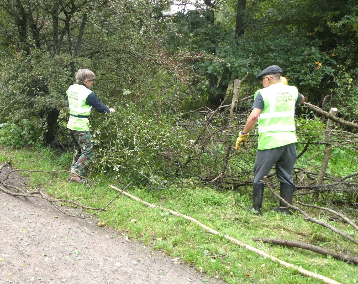 Our aim this week was to construct the same sort of woven dead-hedge as the one we made last week to protect Studley Bridge.