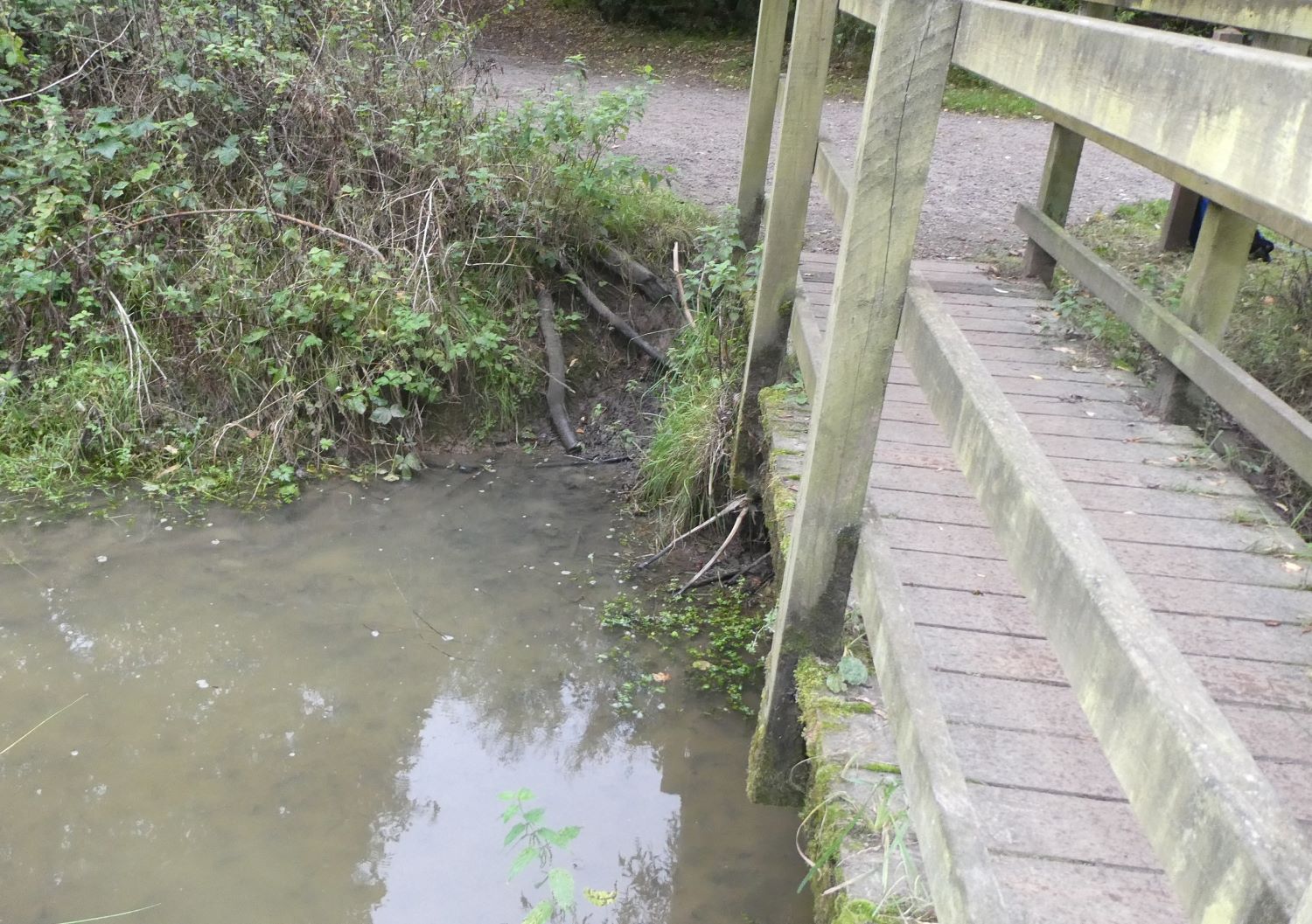 The bridge is perched on concrete piles that were let down into the bank nearly 30 years ago. Gradually, the bank next to the concrete piles is being worn away by dogs that find this the easiest route into the pool. The erosion is threatening the stability of the bridge.