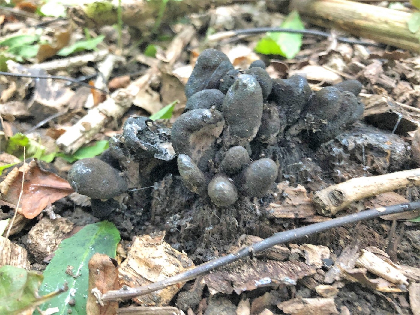 It grows low down, in and on rotting wood with its blackened finger-like fruiting bodies reach upwards, looking for all the world as if someone buried beneath the woodland floor is making a bid for freedom.