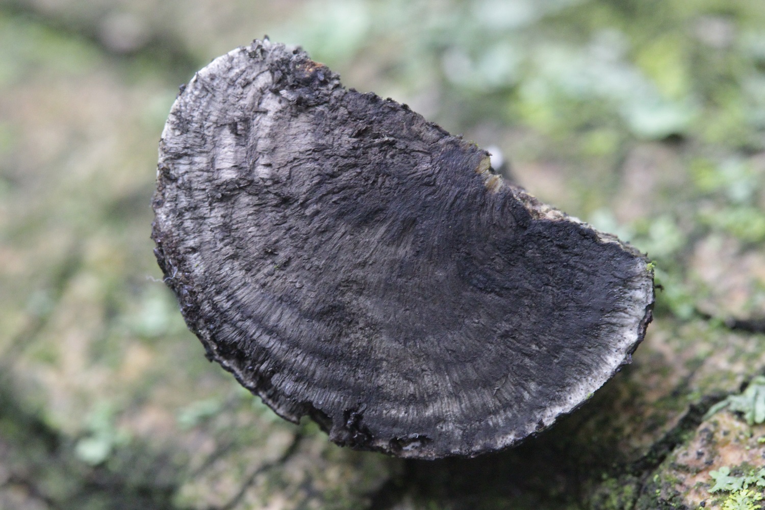 Cut in half, the fungus has clear concentric, silvery grey and black growth rings inside. Just as in the cross section of a tree trunk, each ring is a year’s growth and the species is named for them: concentrica.