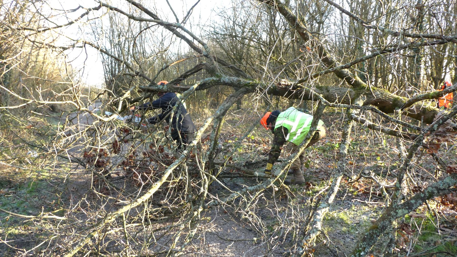 Phil took the tree down and then trimmed off the branches which the rest of us took away and stacked, thus clearing the path. It then became evident that just behind where this tree had been were two more trees with hanging branches.