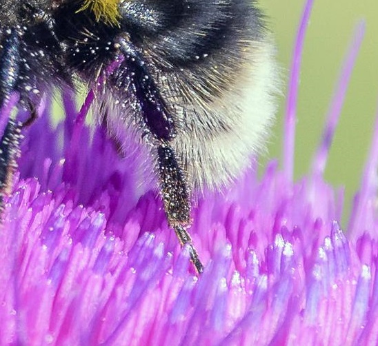 This is a garden bumble bee (Bombus hortorum) collecting nectar in a spear thistle flower at the edge of the large pond.