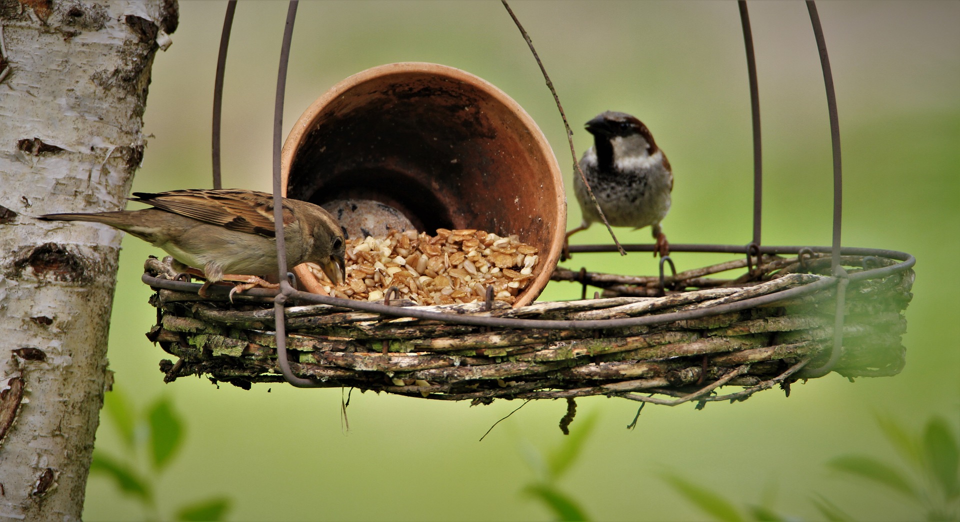 TEN: left to their own devices, house sparrows are seed eaters, and in the UK countryside research has shown that their diet is 90% seeds. But it is an opportunistic and adaptable species that eats whatever foods are available from bird feeders, trash cans, street gutters and wasteland.