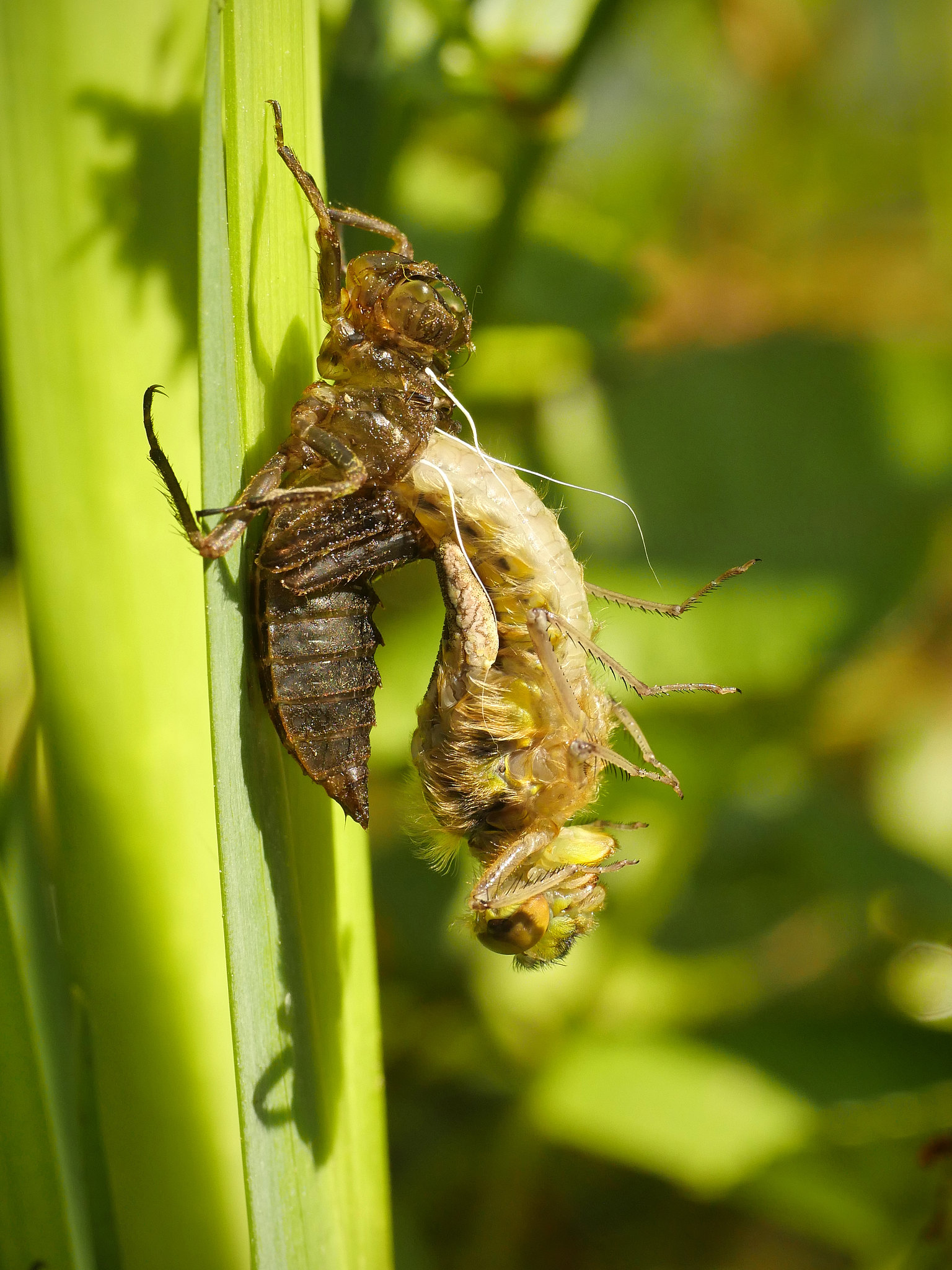 Just like the larval stage in complete metamorphosis, the nymph has to moult its exoskeleton to accommodate its growth. With each moult, it develops more and more adult features. When it is fully grown, it leaves the water and climbs into the vegetation around the pond. The now fully developed adult dragonfly inside expands its thorax and splits the nymphal shell. Slowly, over two or three hours, the adult emerges into the light and spreads its wings.