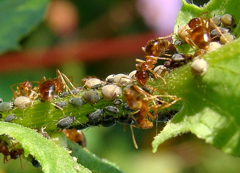 FIVE: ants farm aphids for their honeydew. Sometimes, the ants will protect the aphids from bad weather and from natural enemies by biting through leaf veins so that the leaves curl round into bivouacs.