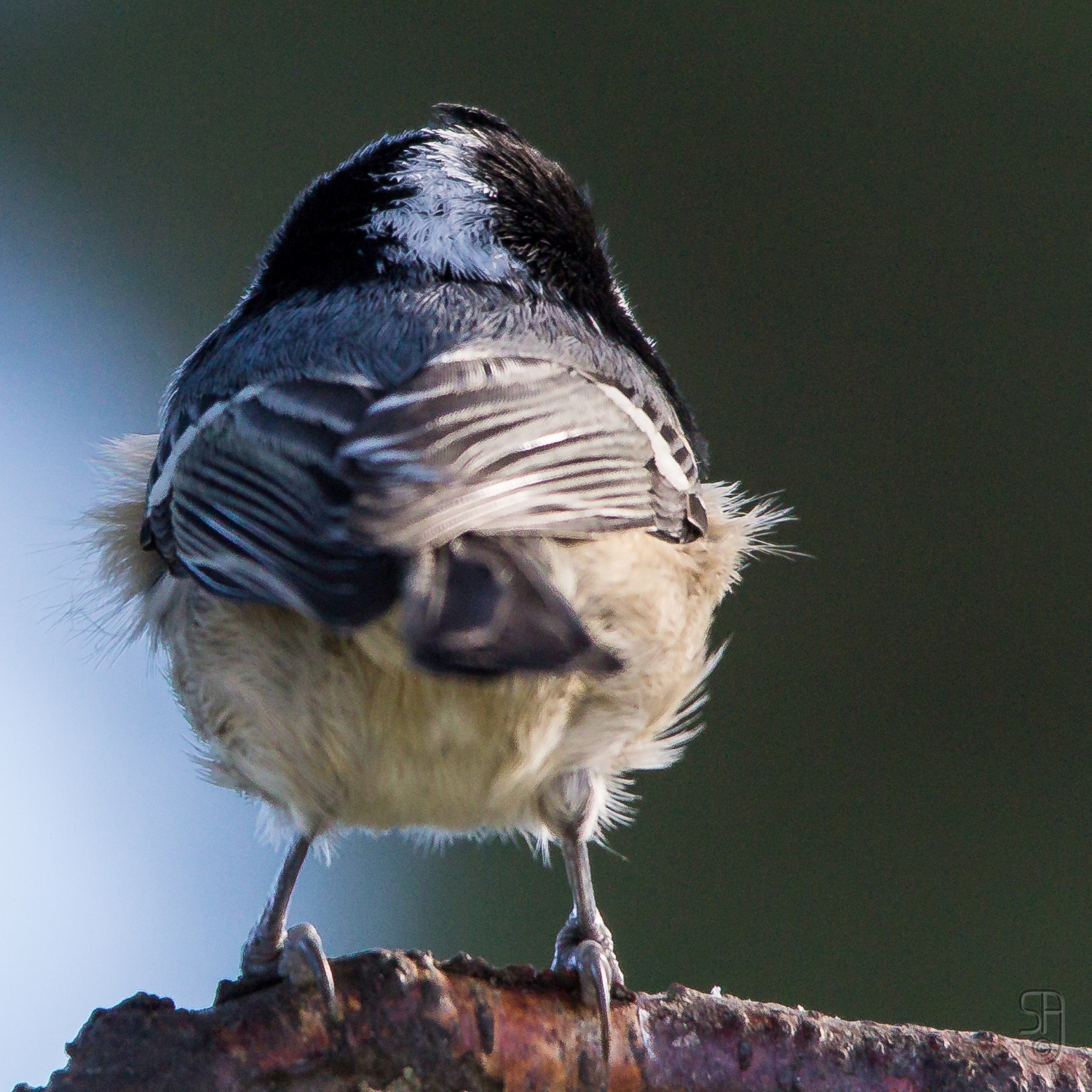 A coal tit has a creamy buff belly and a grey back that is interrupted by the white bars on its folded wing feathers. It has a black bib, white cheeks and a black cap that extends right down to the base of its neck. The most distinctive feature, however, is a white stripe running down the back of of its head. This is what marks it out from our other Paridae.