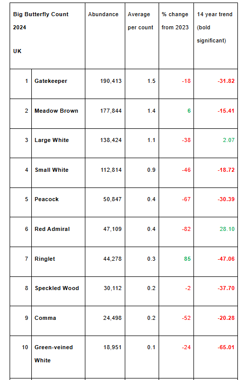Over a three week period in July and August, more than 85,000 participants recorded 935,000 butterflies and day-flying moths, a total almost 600,000 fewer than 2023’s. There were 9,000 counts in which no butterflies were seen at all, the highest ever number of zero-counts. Previously, the lowest average number of butterflies seen in a 15 minute count was nine (in 2022), this year that average is 22% lower: just seven butterflies per 15 minute count.