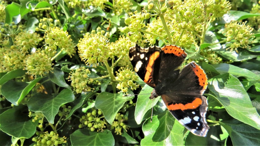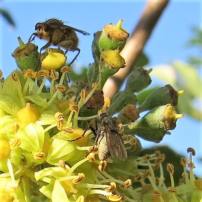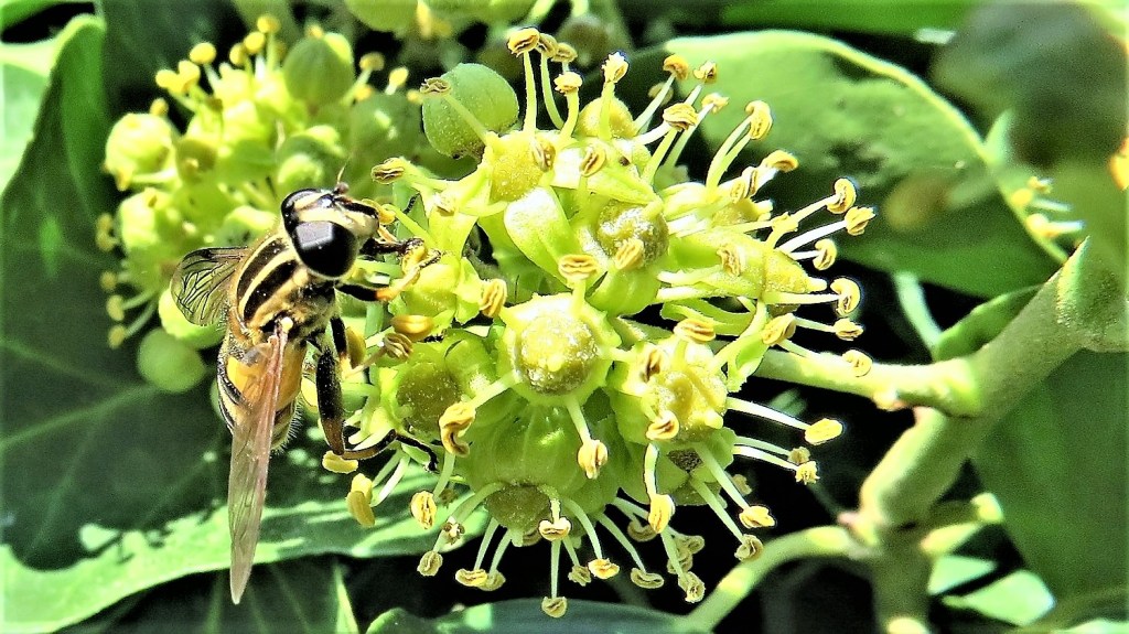 Ivy is habitat: home and a sound living for possibly hundreds of species. Bats roost, birds and small mammals nest in ivy; caterpillars feed on its leaves; wasps, hoverflies (all kinds of flies), bees and butterflies feed on its nectar; pigeons and thrushes get intoxicated on its ripe berries.