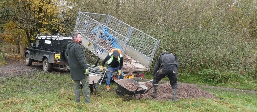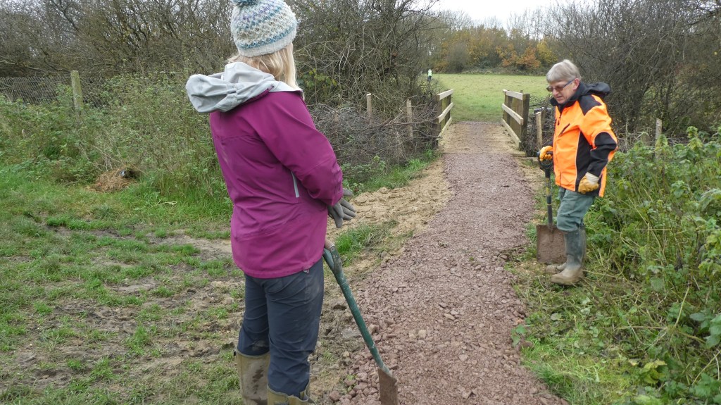 The Wednesday work party was slightly rained on but on the whole we were in a window of better weather. The business of the day was installing a new seat by the pond.